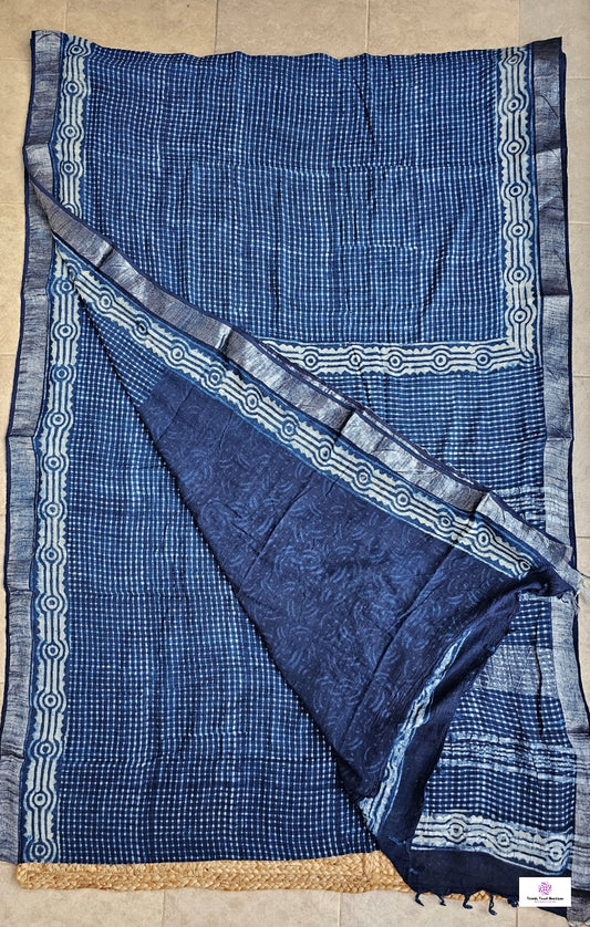 Indigo Check - Hand Block Print - Linen Cotton Saree