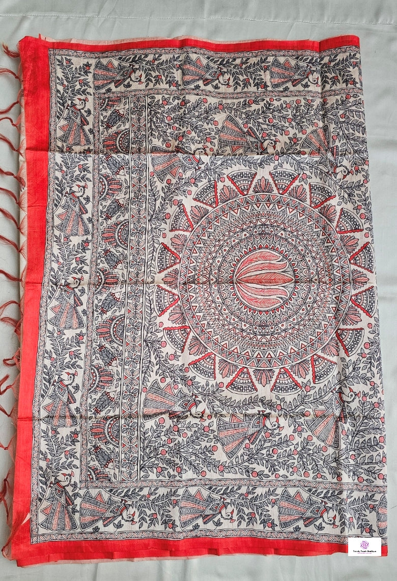Every motif in Madhubani art is a language of symbols, and Peacock speaks it fluently. Crafted in semi Ghicha silk, this saree carries an exquisite traditional Madhubani digital print across its palla and border, set against a virgin ghicha base with vibrant orange accents — a subtle yet striking harmony. The motifs are not mere decoration; they are stories drawn from nature and life. The lotus blooms for purity and growth, trees stand for rooted strength. Fish swim across the canvas as signs of prosperity, fertility, and harmony, while the peacock — regal and radiant — becomes the centerpiece, symbolizing beauty, grace, and celebration.
