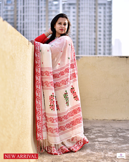 Beenapani - Bengal Handloom - Red White Cotton Saree (120 Count)