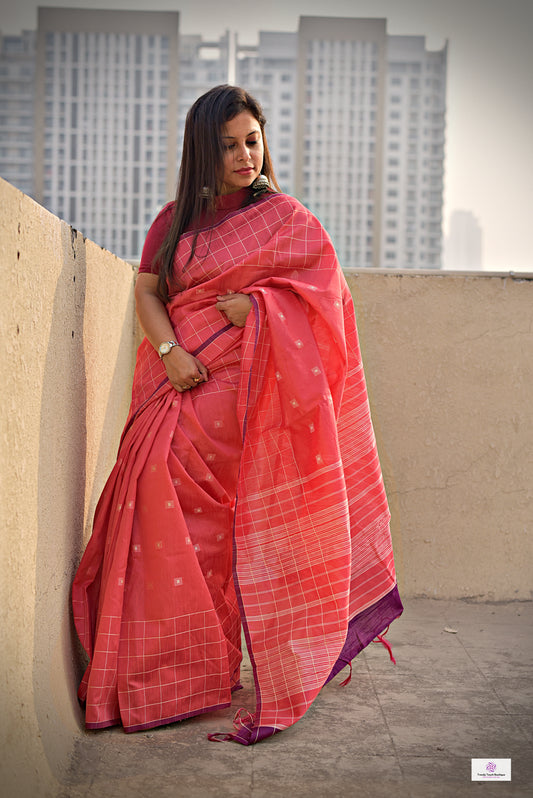 Vidya - Bengal Handloom - Light Chocolate Red Cotton Saree (120 Count)