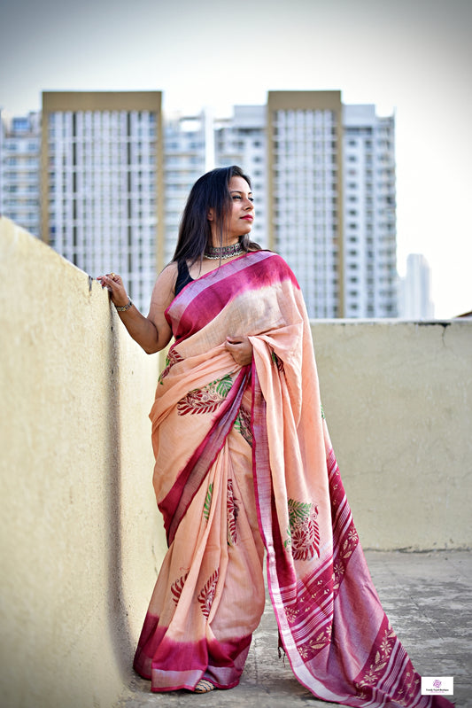 Ushoshi - Hand Block Print - Linen Cotton Saree