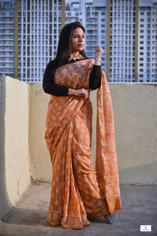 Peachy - Hand Block Print - Chanderi Silk Saree