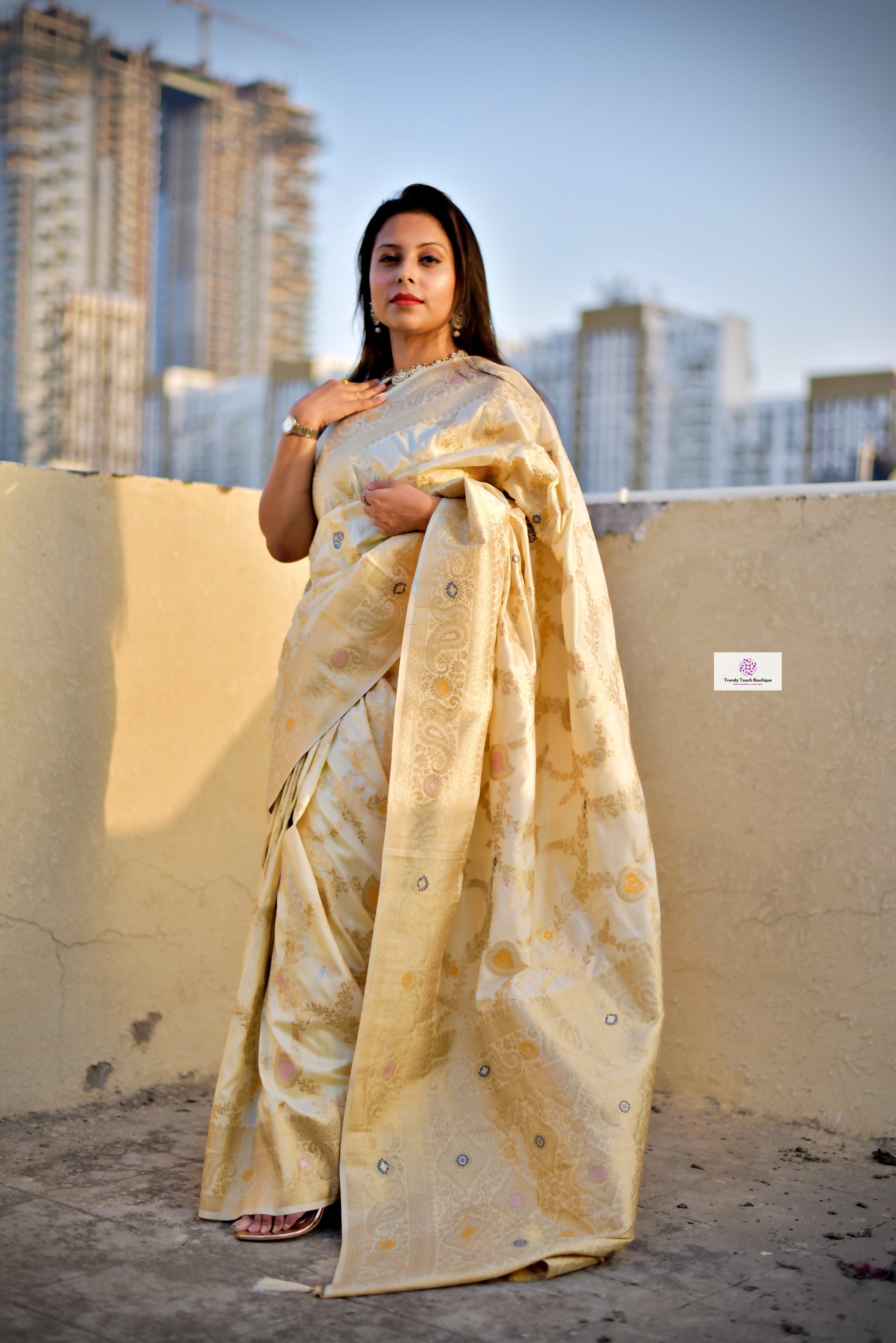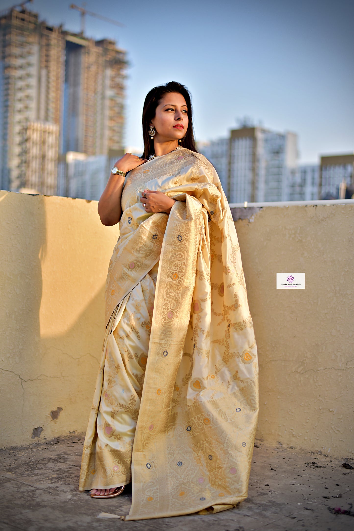 Be the radiant bride youâve always imagined in this gorgeous APSARA Gold Zari Jaal Woven Banarasi Saree. Expertly crafted of ivory with intricate gold zari and meenakari work throughout - itâs a timeless bridal choice youâll treasure forever. Flaunting a lightweight and effortless drape, itâs the perfect gift for a bride or newlywed, and the ideal saree in any trousseau or cocktail party!