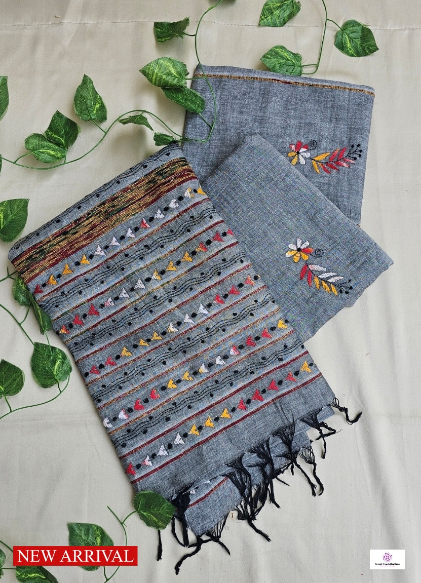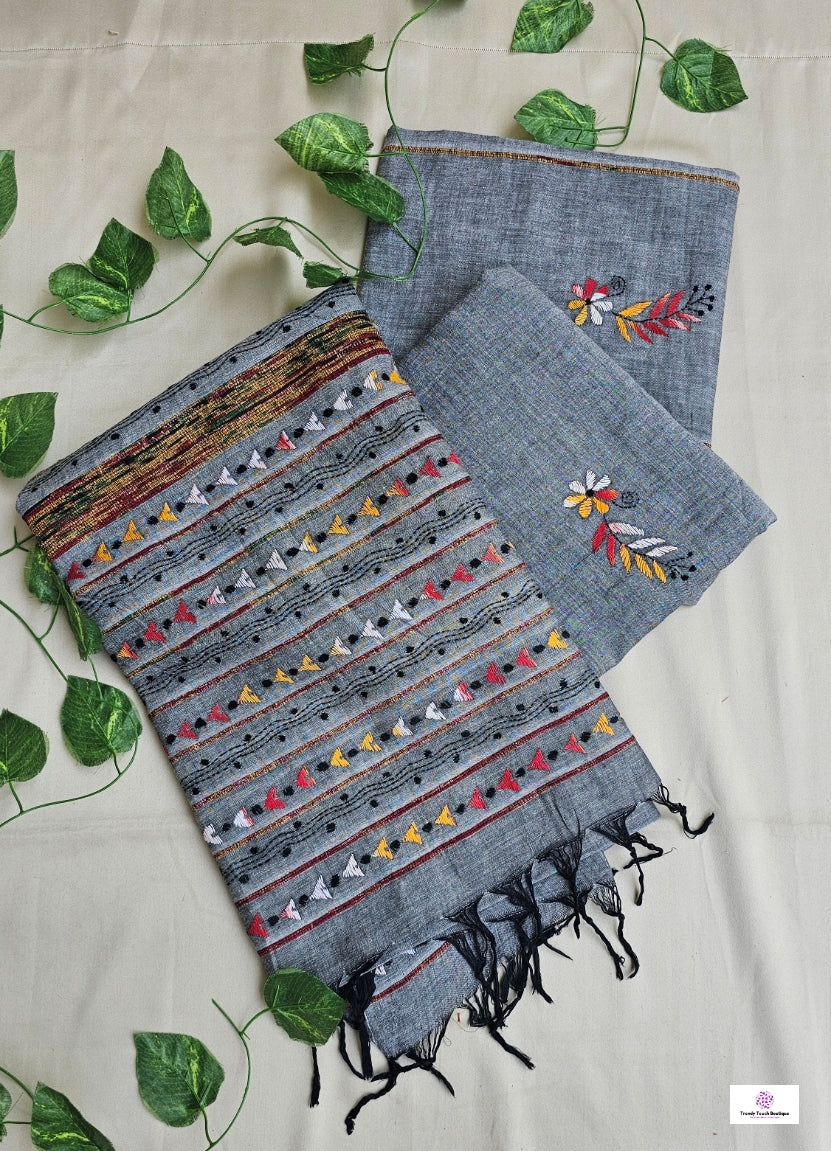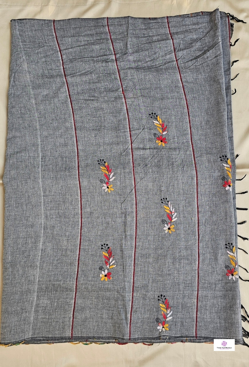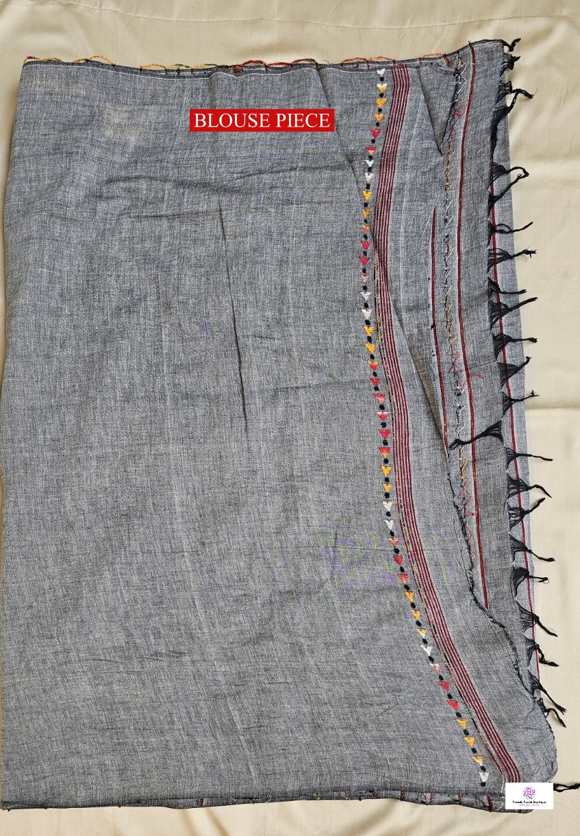 Elevate your style with our exquisite Kantha hand-embroidered designer khesh cotton handloom saree in grey with multicolored thread work. Crafted for comfort and elegance, this lightweight saree is perfect for office events or family functions.