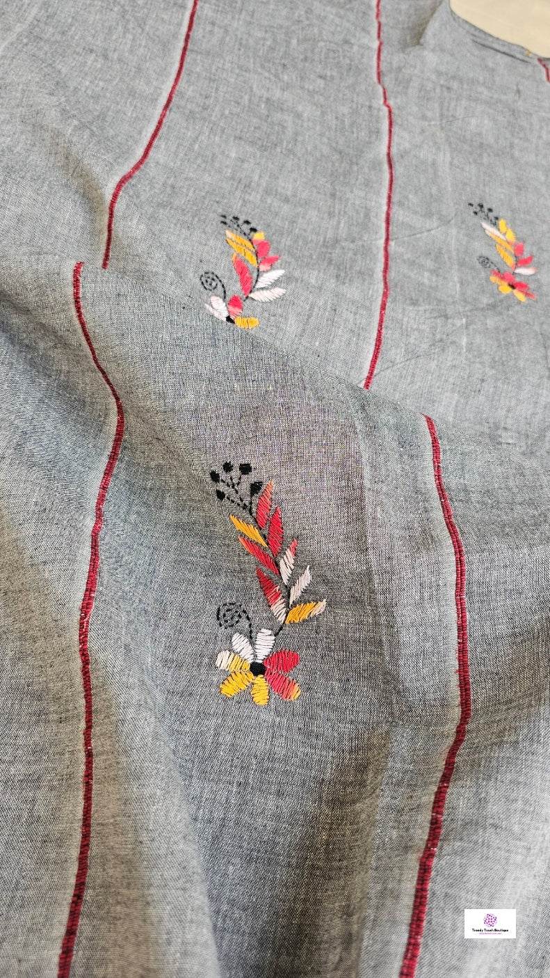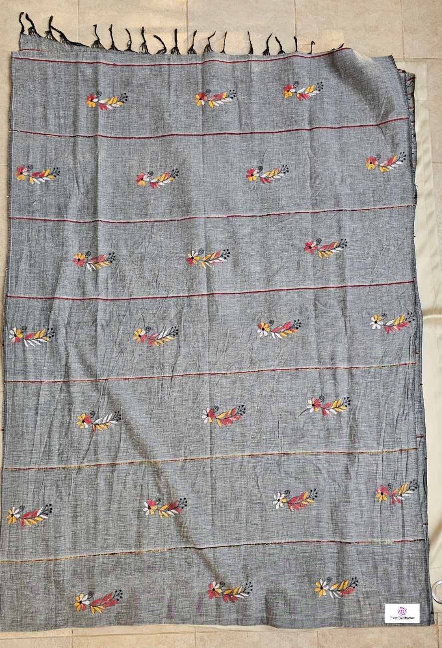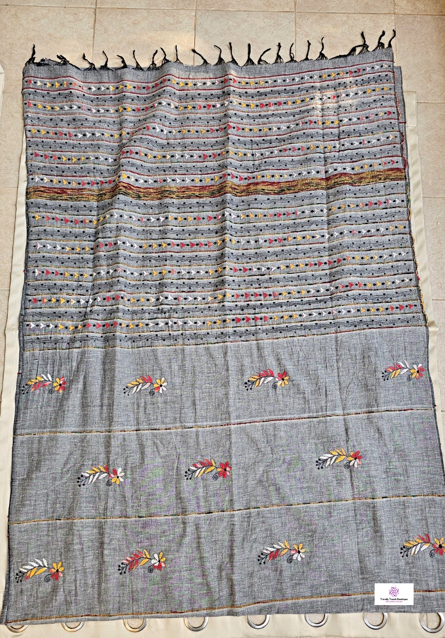 Elevate your style with our exquisite Kantha hand-embroidered designer khesh cotton handloom saree in grey with multicolored thread work. Crafted for comfort and elegance, this lightweight saree is perfect for office events or family functions.