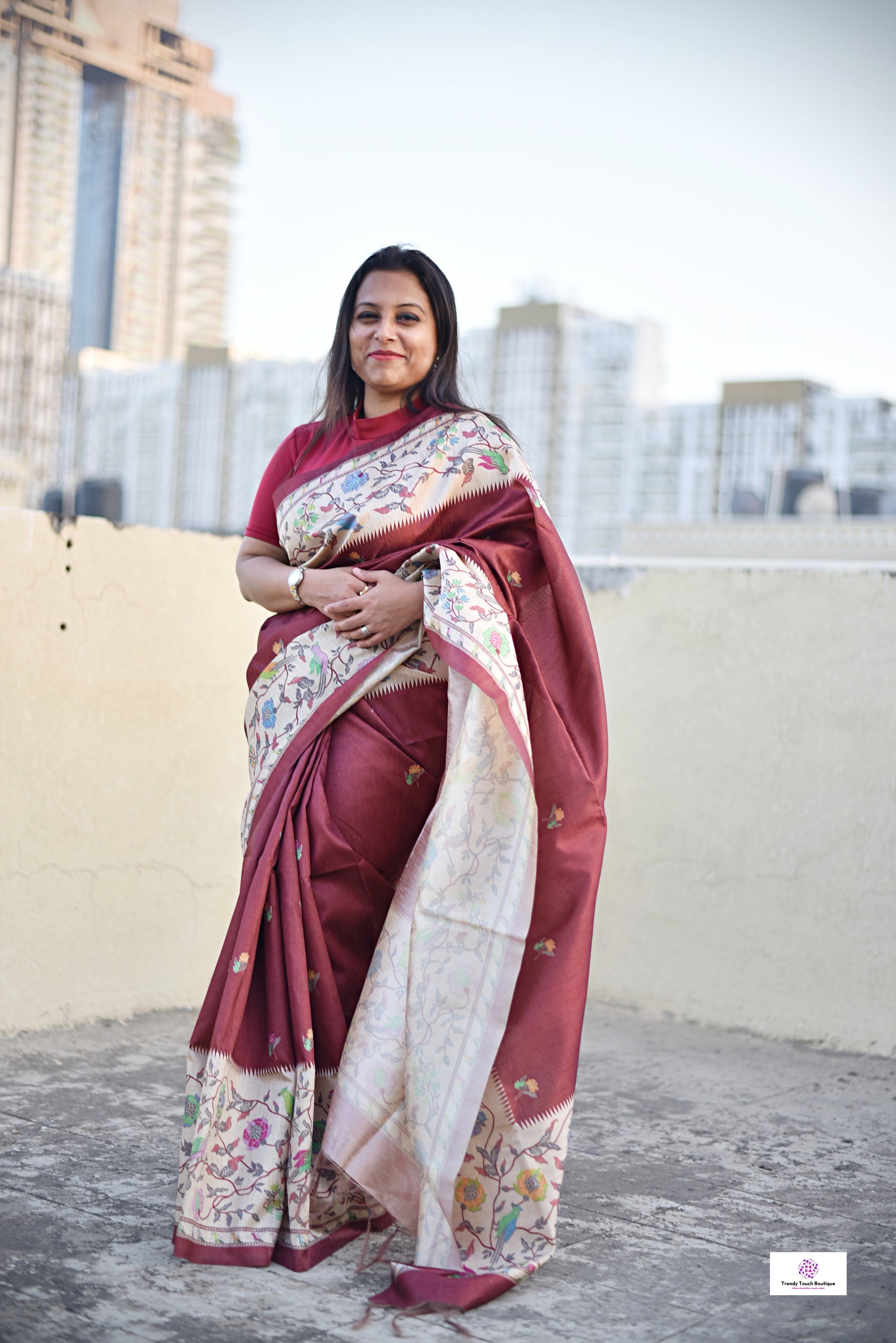 This semi tussar silk saree combines style and practicality, featuring traditional paithani pattern digital print on a royal maroon. Perfect for the busy woman, it’s low-maintenance, budget-friendly, and effortlessly stylish—an ideal addition to your versatile, comfort-focused saree wardrobe. Embrace a style that keepsup with your everyday pace!