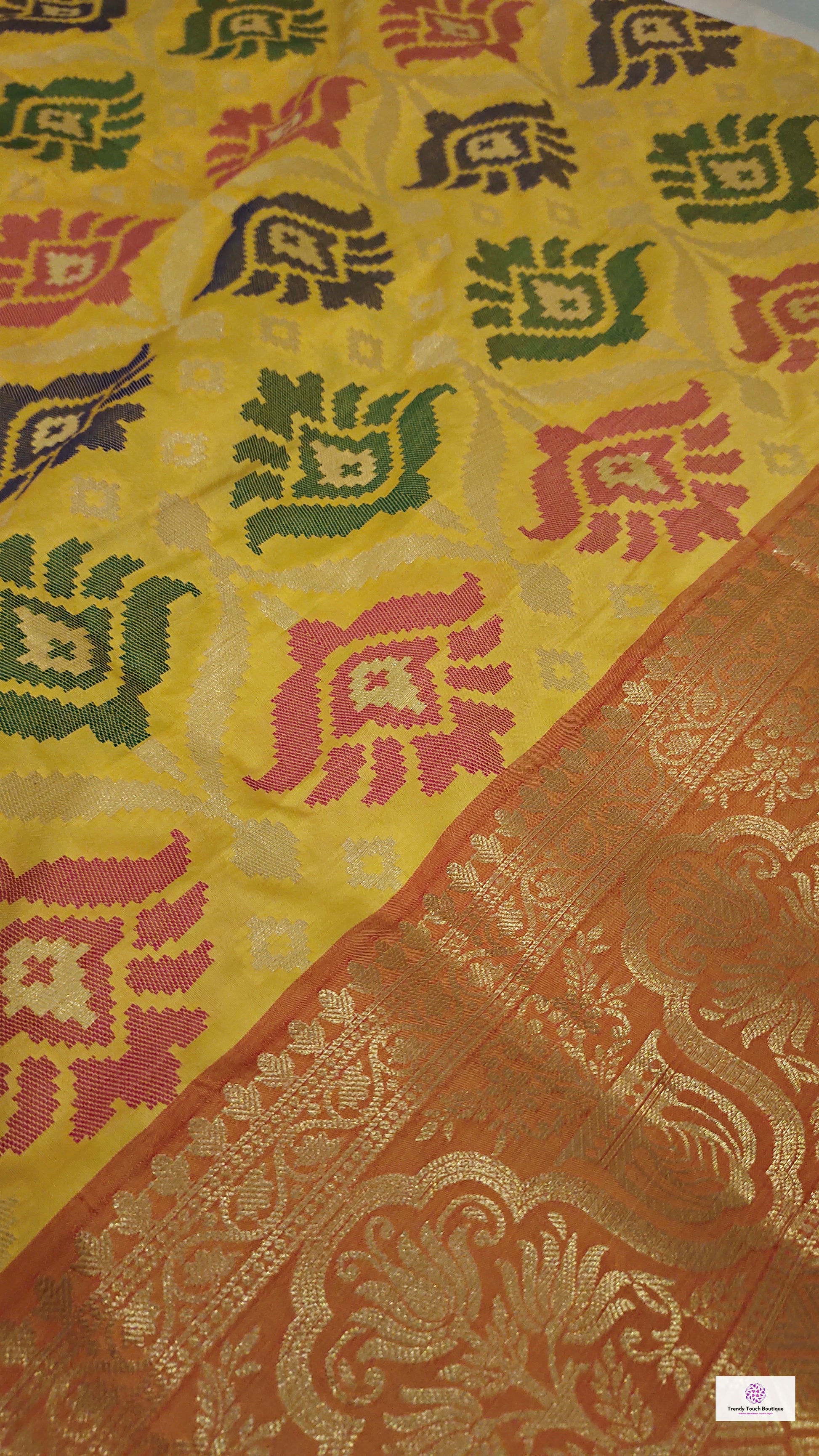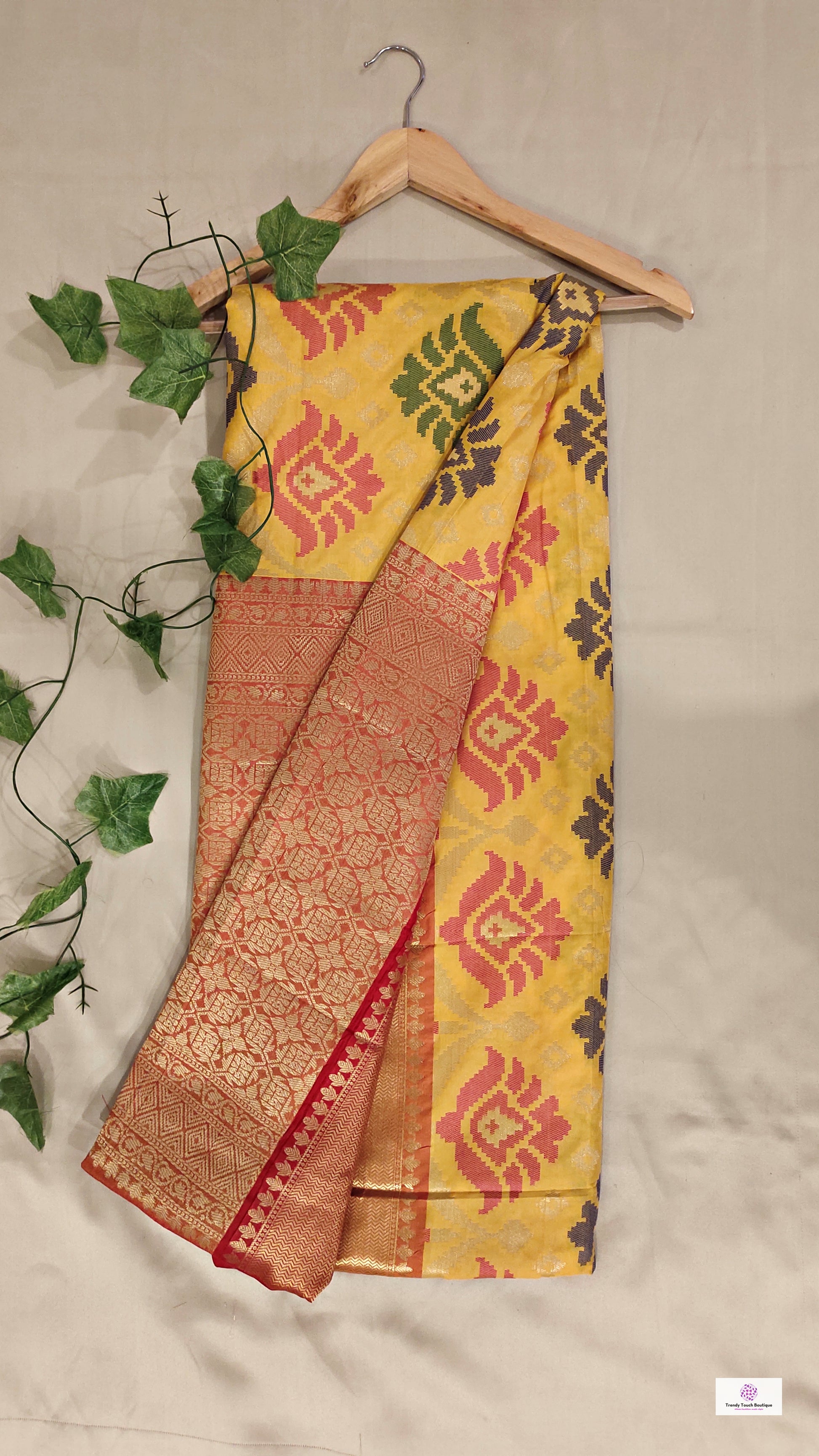 Drape yourself in timeless elegance with our Black Floral Pattern Silk Saree featuring a lustrous gold zari-woven pink pallu and border. Crafted from soft silk, this saree effortlessly enhances your style for any celebration, embodying grace and sophistication.
