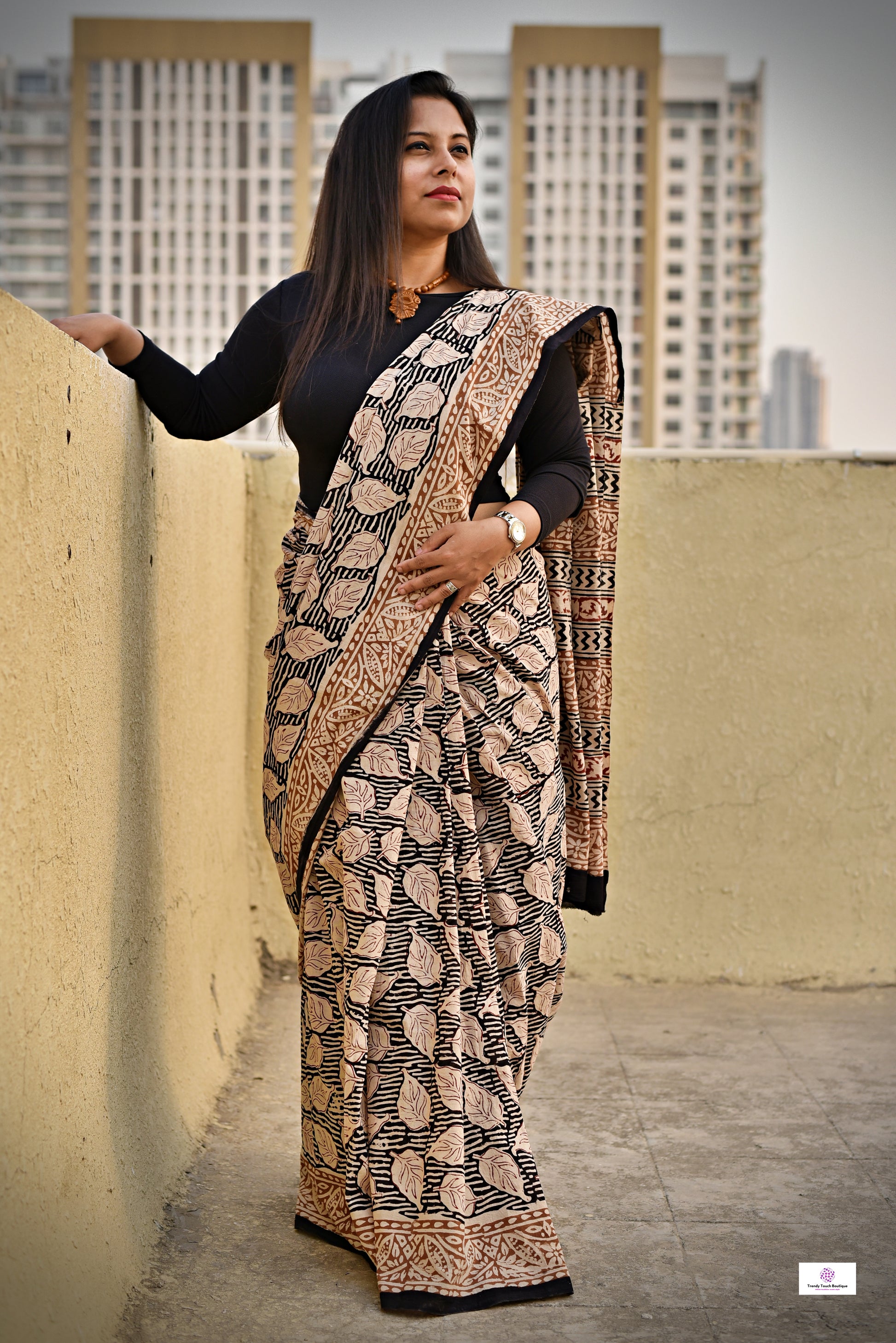Discover the latest in eco-chic fashion with our handblock printed mulcotton sarees, featuring new designs in organic color dyes perfect for spring-summer styling. Handcrafted to keep you cool and comfortable for hours. Pretty leaf patterns handblock printed in a combination of black and beige. Best for both formal and informal styling.