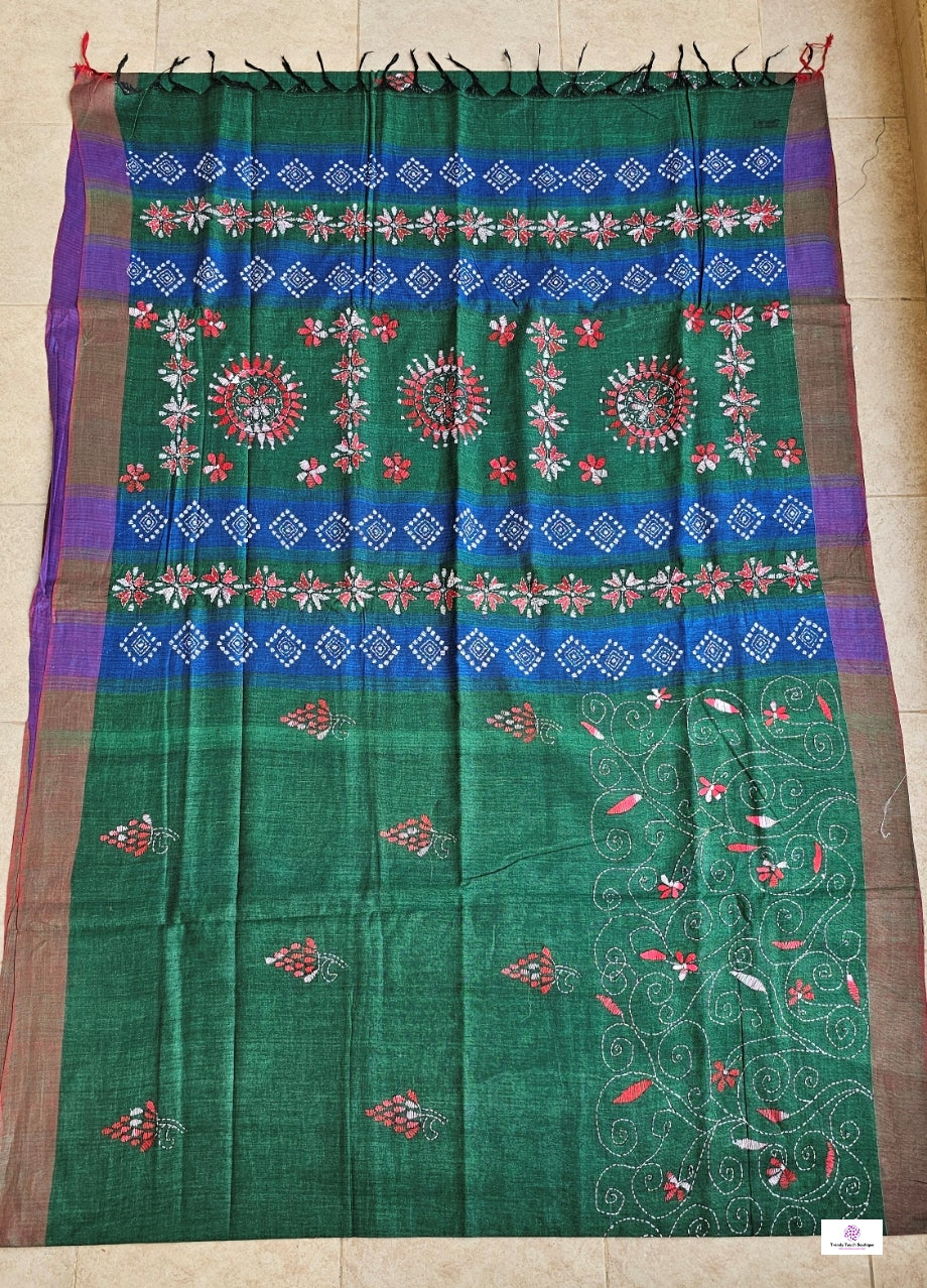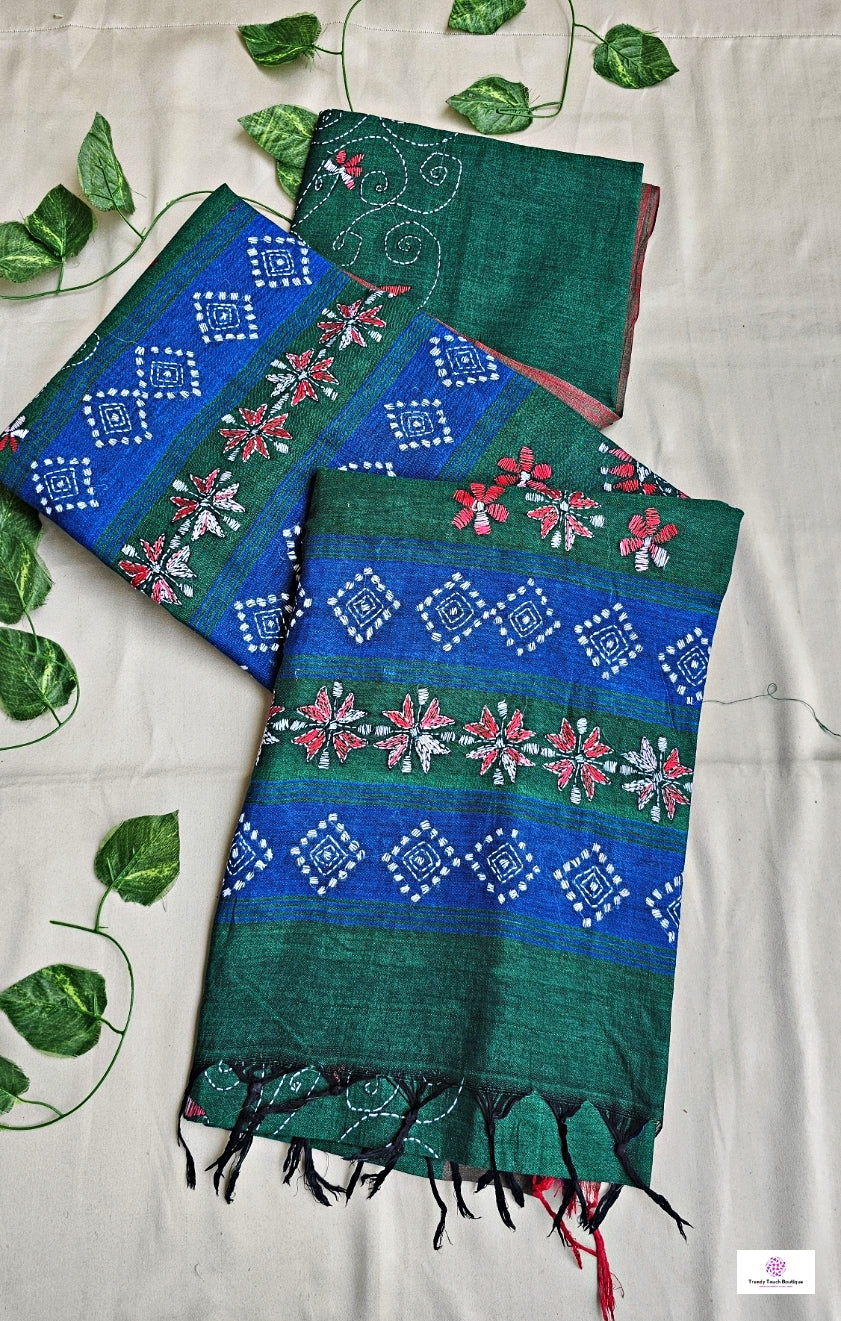 Step into effortless elegance with this pure cotton handloom saree in green and blue contrast with pinkish border—perfect for summer days and festive evenings alike. Intricately hand-embroidered with floral kantha stitches in white pink multicolor shaded thread, it blends timeless tradition with comfort. Comes with a matching blouse piece, making it a go-to pick for all seasons and occasions.