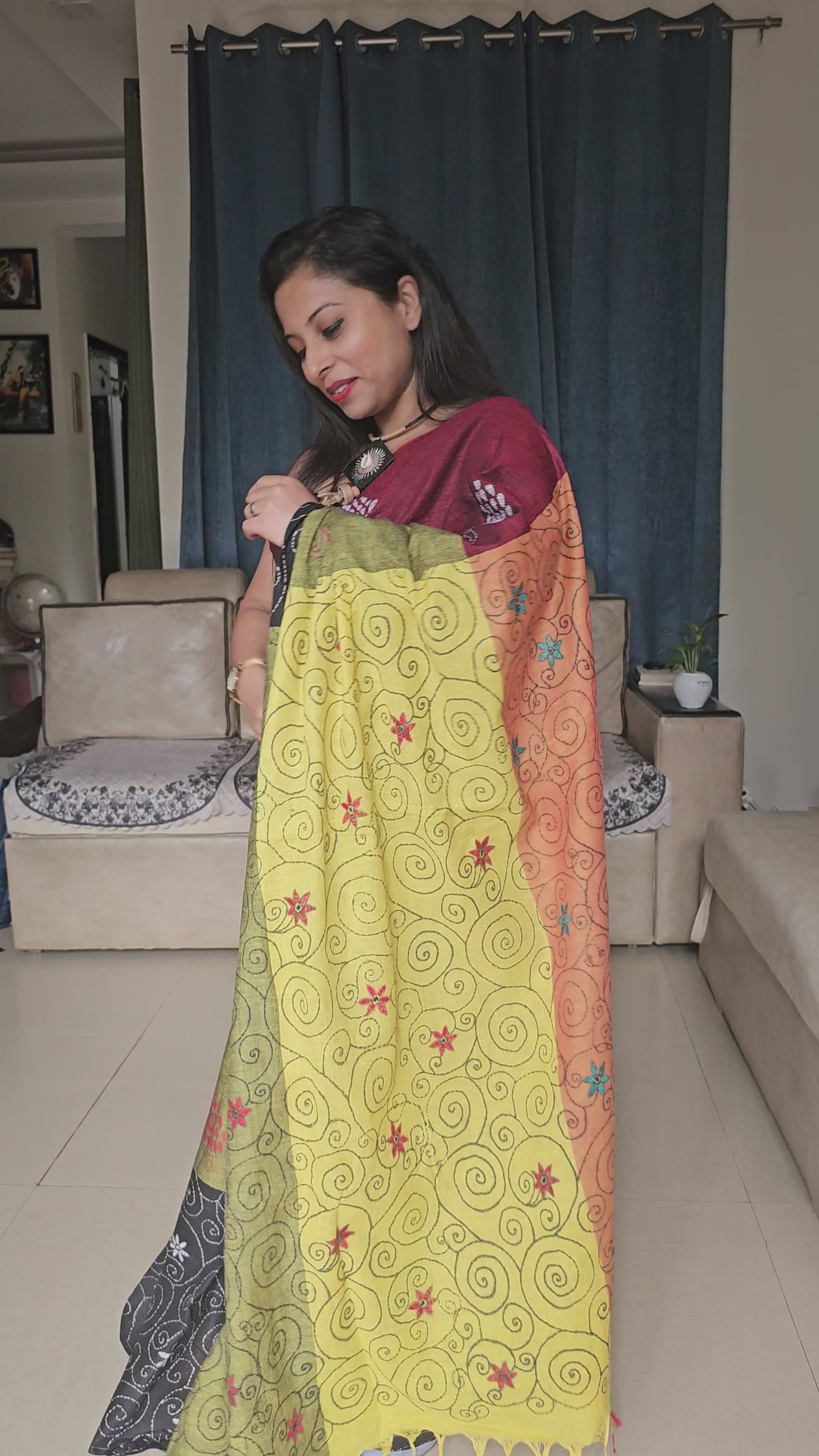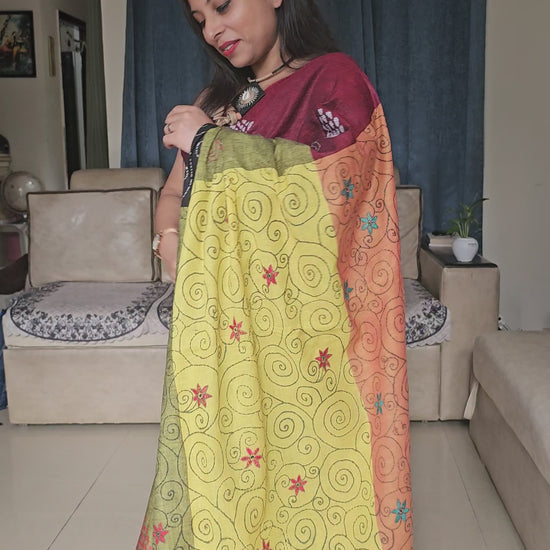 Elevate your style with our exquisite Kantha hand-embroidered designer cotton handloom saree in a beautiful black, yellow, green and red color block pattern. Handcrafted for comfort and elegance, this breathable saree is perfect for office events or family functions, all year round.