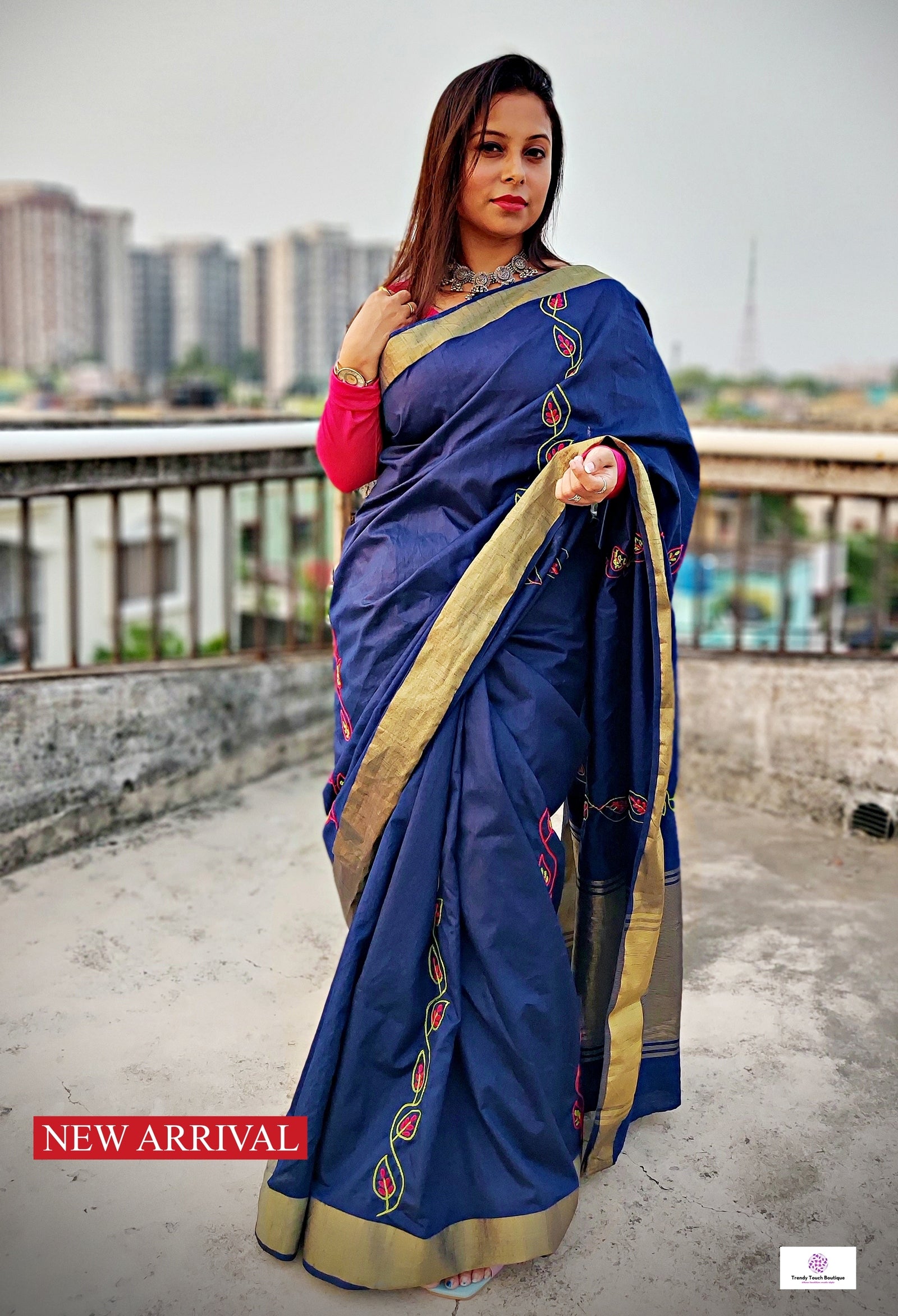 Indulge in timeless elegance with this designer cotton silk saree in a stunning shade of blue. Intricately hand-embroidered leaf lines gracefully adorn the saree, adding a touch of sophistication to its minimalist design concept. Whether you're attending a cocktail party, enjoying a dinner soirée, or simply looking for a chic summer ensemble, this saree is the perfect choice.