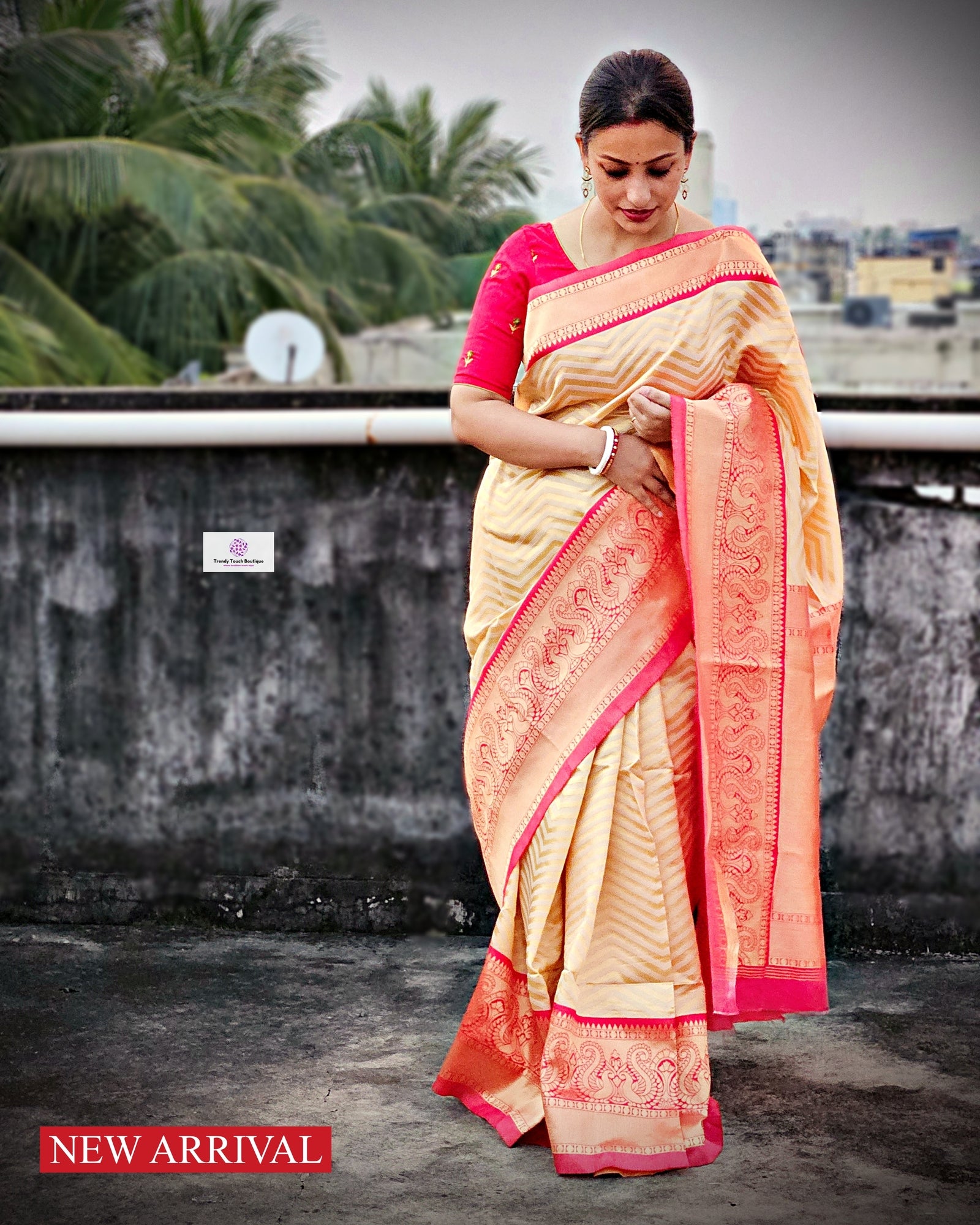 Experience festivities like never before with DOODHE ALTA Golden Yellow & Red Soft Silk Saree. It's perfect for bridal trousseau as the lightweight fabric is easy to carry for long hours. The intricate zari woven border and red border golden body with zigzag pattern make this traditional silk perfect for gifting to newlyweds.