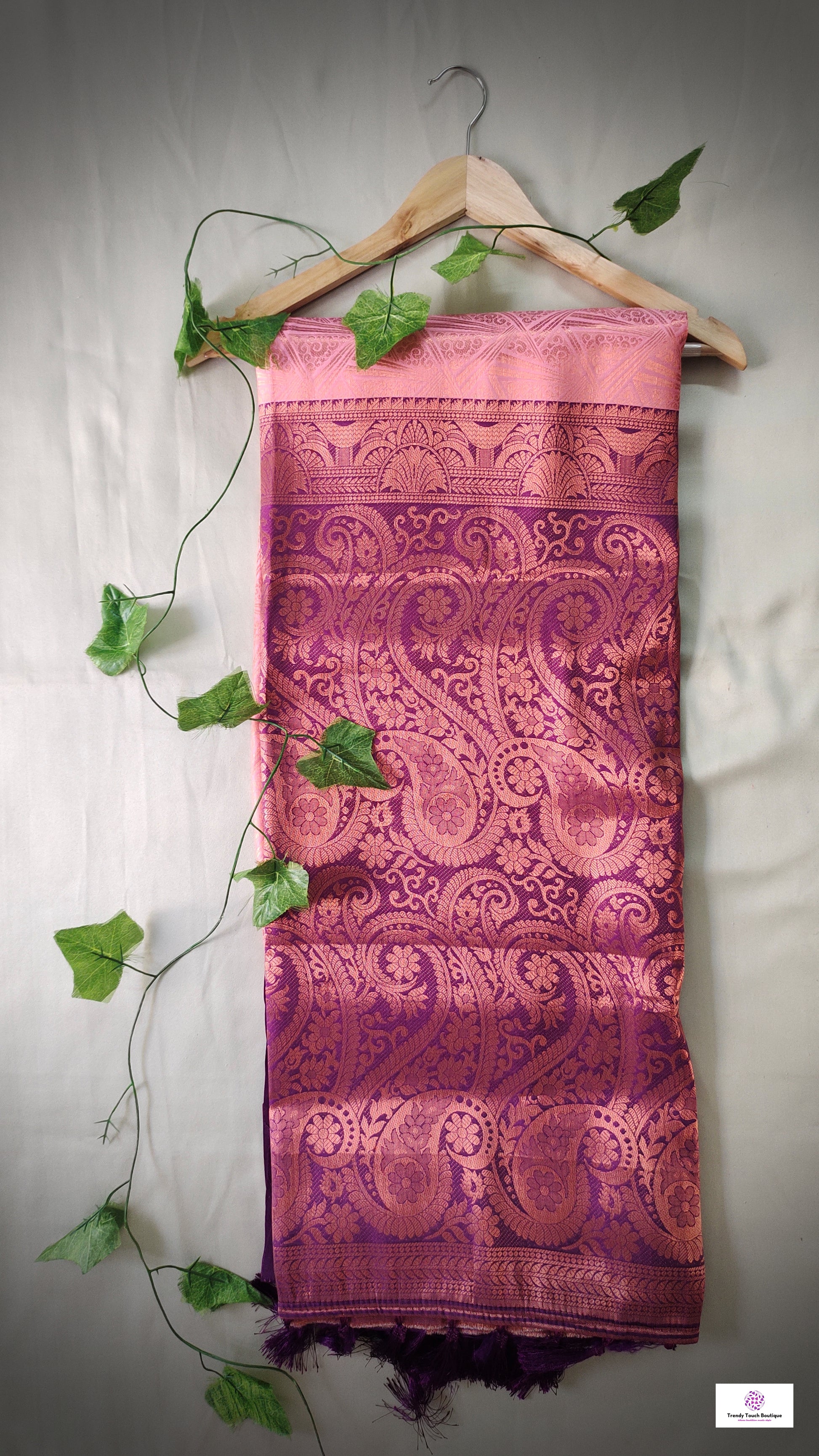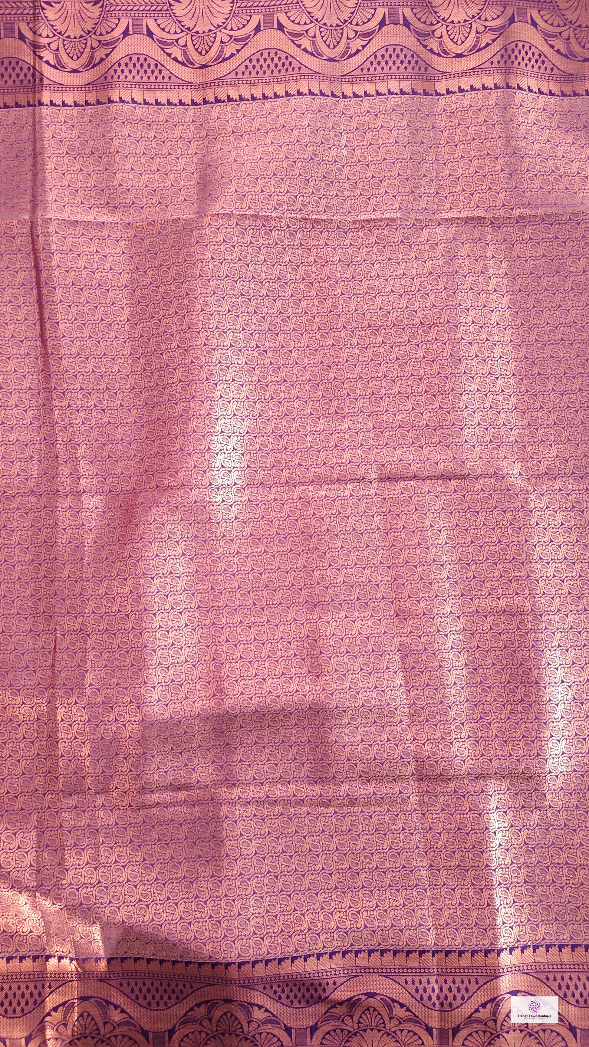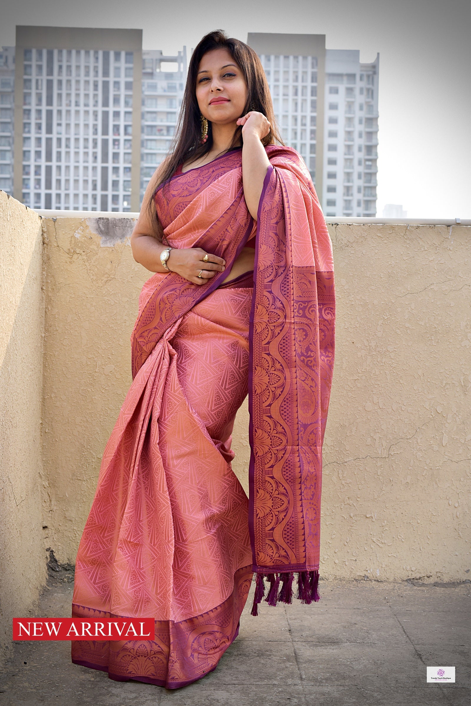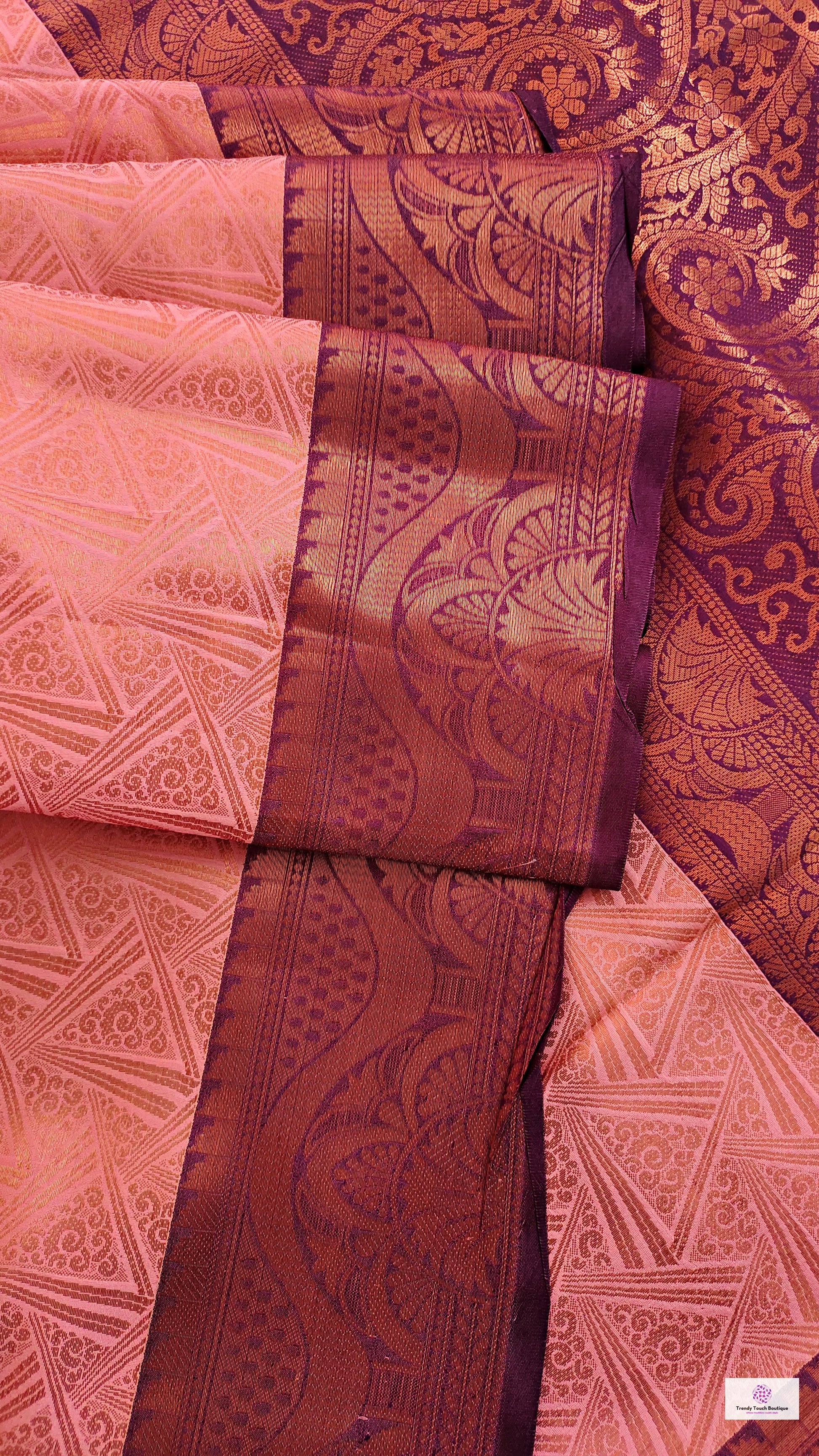 - Color: Peach Pink Body with Maroon Border (Metallic Copper Zari work)