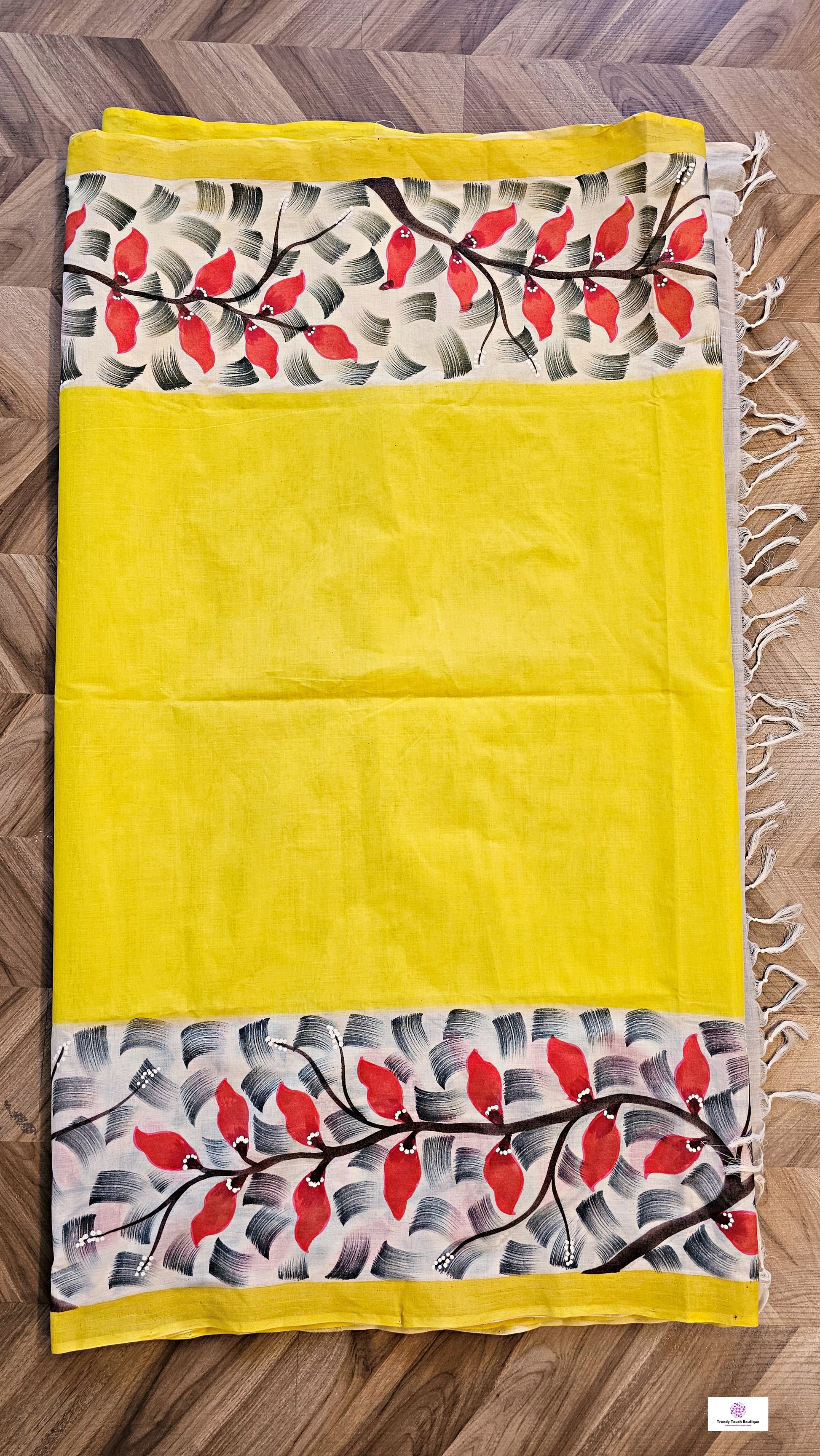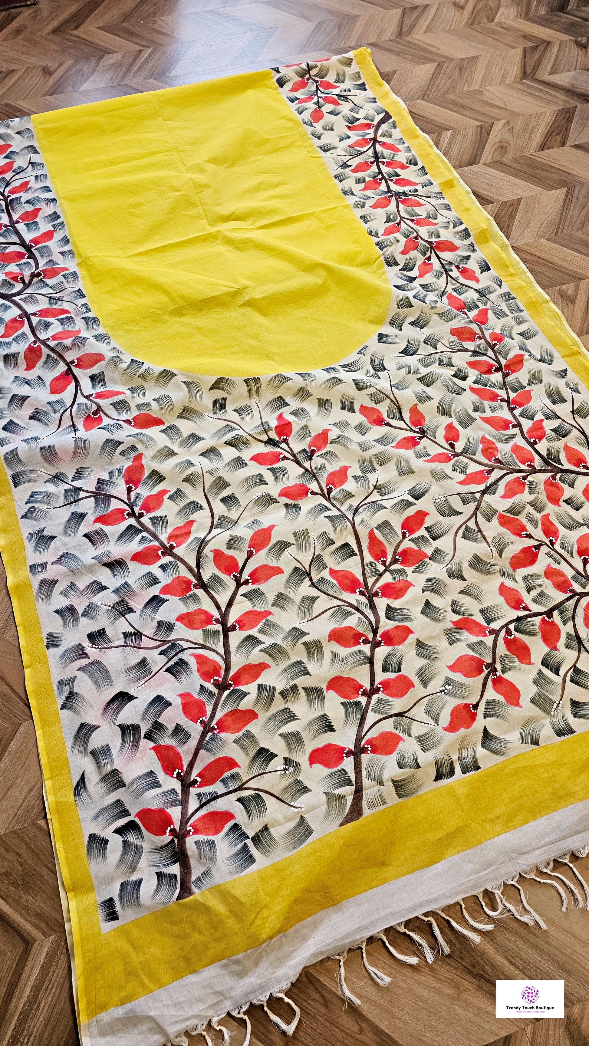 This handpainted pure cotton saree is a canvas of spring itself — a soothing blend of yellow and white brought alive with delicate floral patterns in shades of grey and orange, each brushstroke echoing the joy of blossoms in bloom. Lightweight and breathable, it carries the freshness of the season, while its artistry transforms fabric into poetry, an expression of how delightful spring can truly be. Draping it feels like wearing an artist’s dream, where comfort meets elegance and every detail whispers the story of renewal and grace. 🌸
