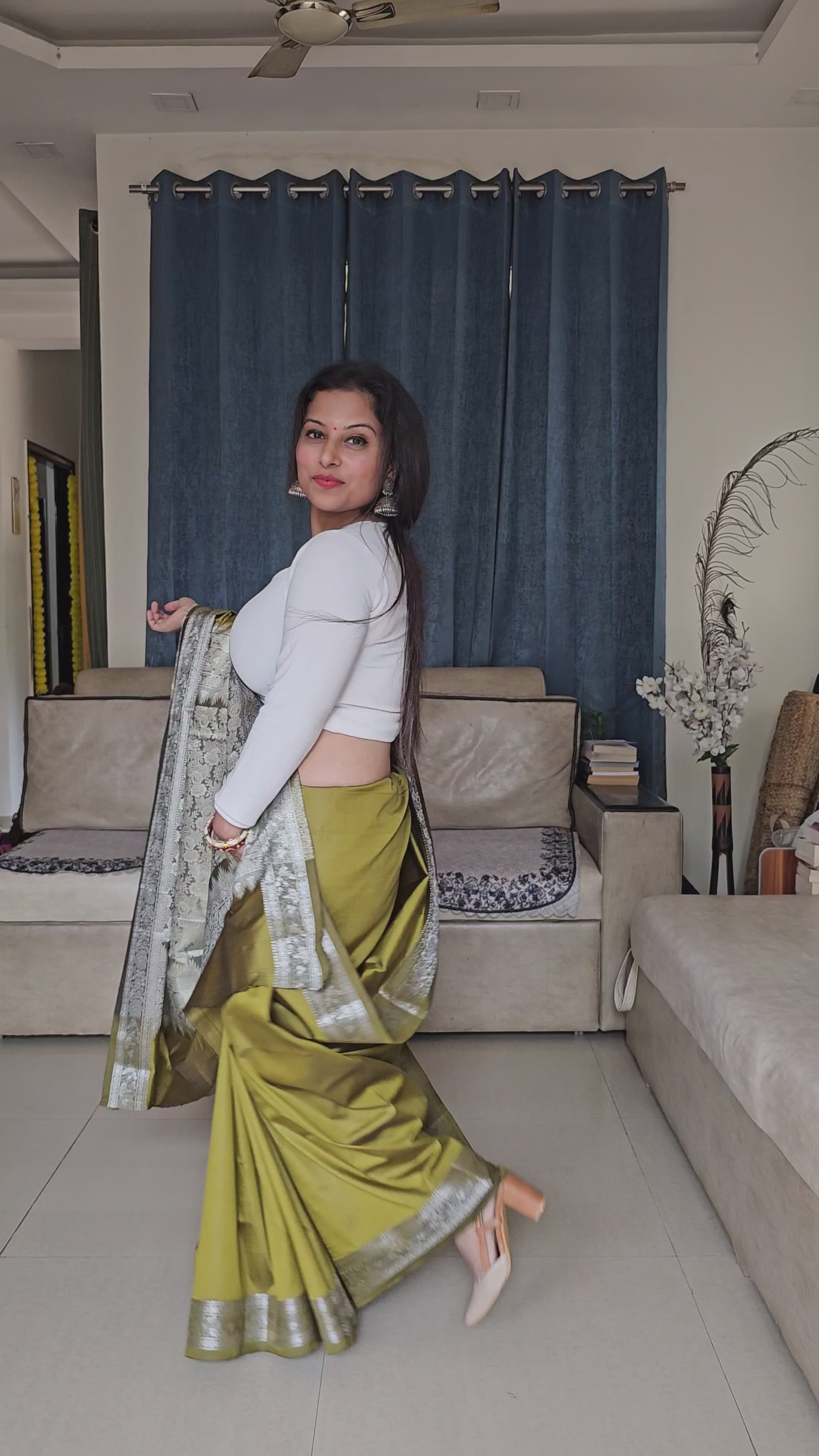 Woven in mehndi green and silver, this katan silk has intricate floral work on the pallu, is lightweight and buttery soft. Stay comfortable all day for both formal and casual events, look and feel like a goddess in this luxurious drape.Â