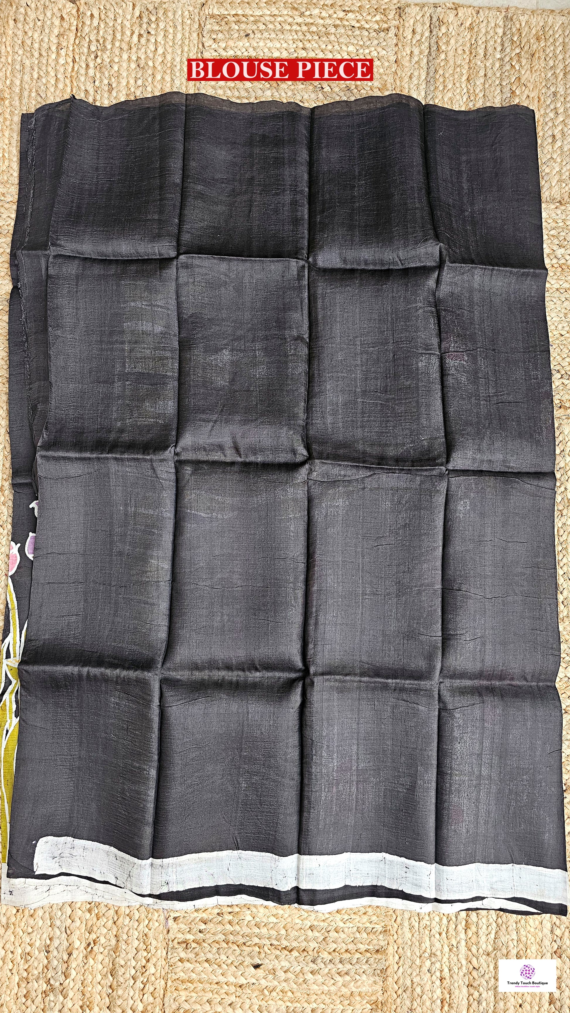 Handloom Hand Wax Batik Murshidabad Mulberry Pure Silk Saree with Silk Mark certification — handcrafted by skilled artisans of West Bengal. Contemporary floral motifs in multicolor hue hand drawn using shoru tuli in on a grey and black cracked batik canvas on palla achieved with traditional manual wax-resist dyeing technique, a heritage art form practiced for generations. Made from 100% pure mulberry silk, woven using 3-ply silk yarn for superior strength, a richer fall, natural sheen. The saree comes with an unstitched running blouse piece.