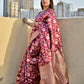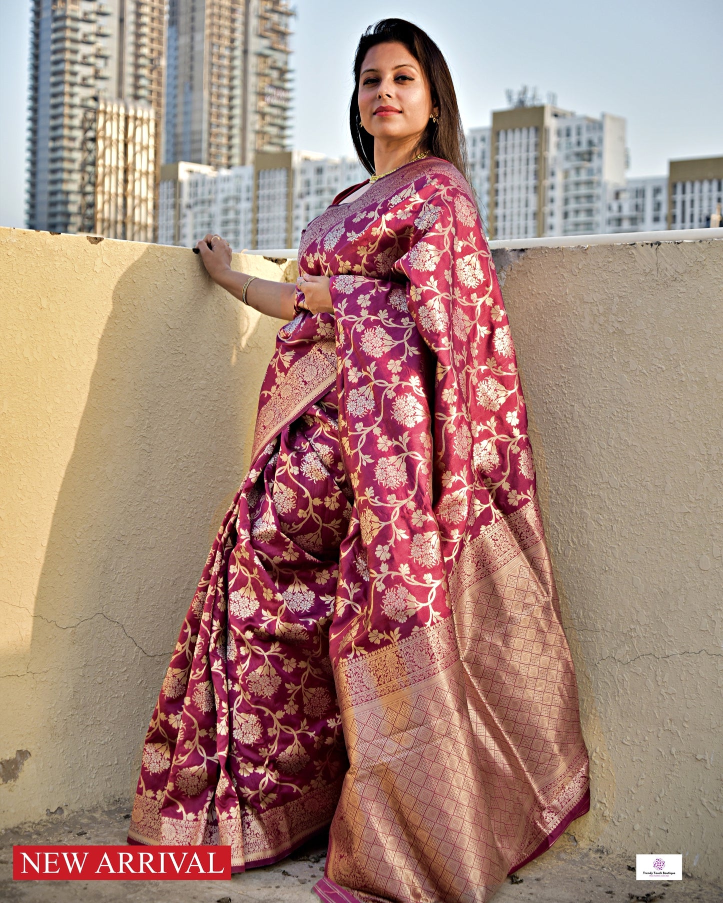 Add a touch of elegance to your festive look with our Banarasi silk saree in a rich wine color. The saree boasts a jacquard woven pallu and intricate Jaal Zari work throughout the body, complemented by a zari-worked border. Whether it's a party or any celebration, this saree brings a touch of glamour to your festive wardrobe, making you stand out with its opulence.