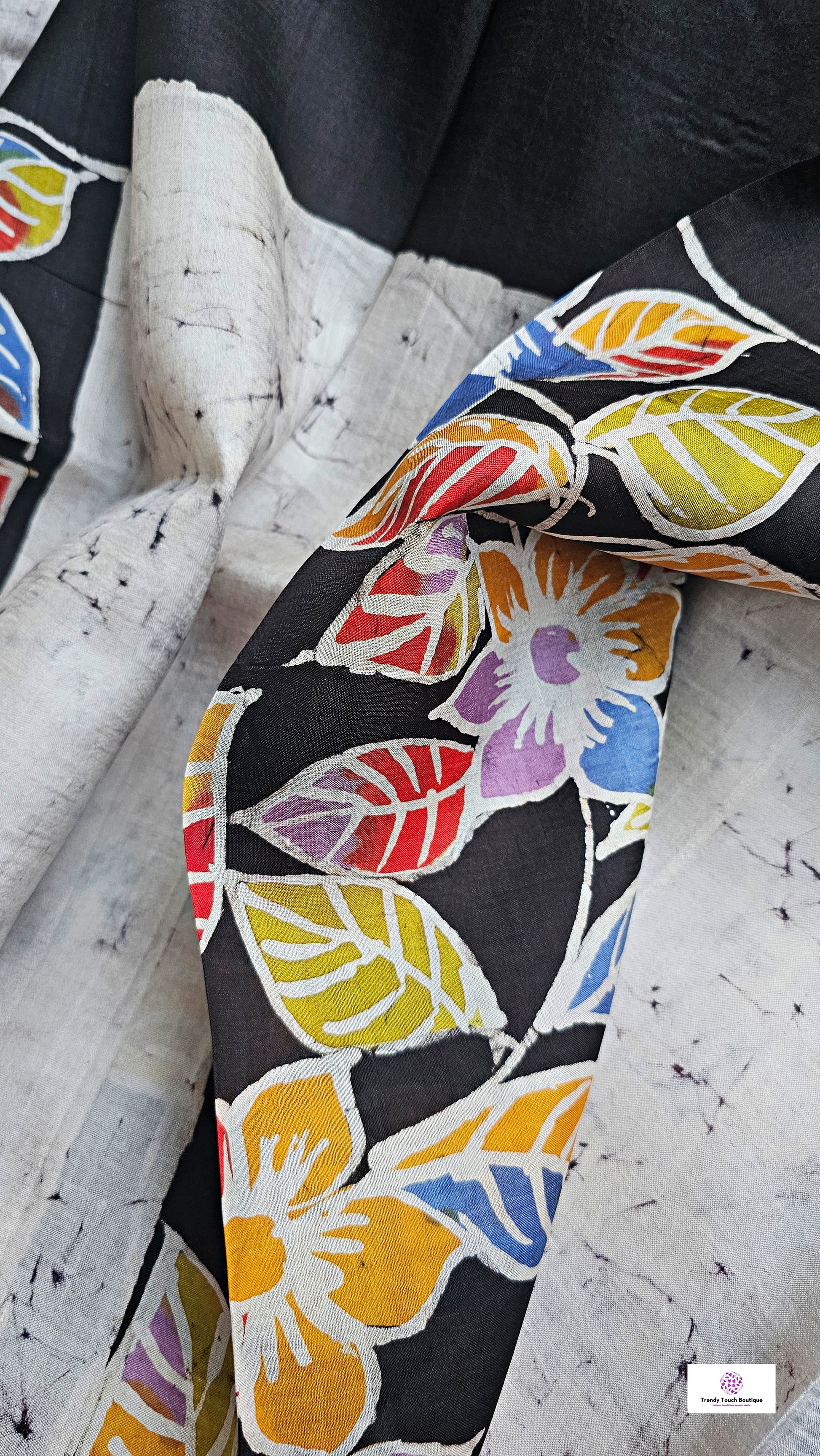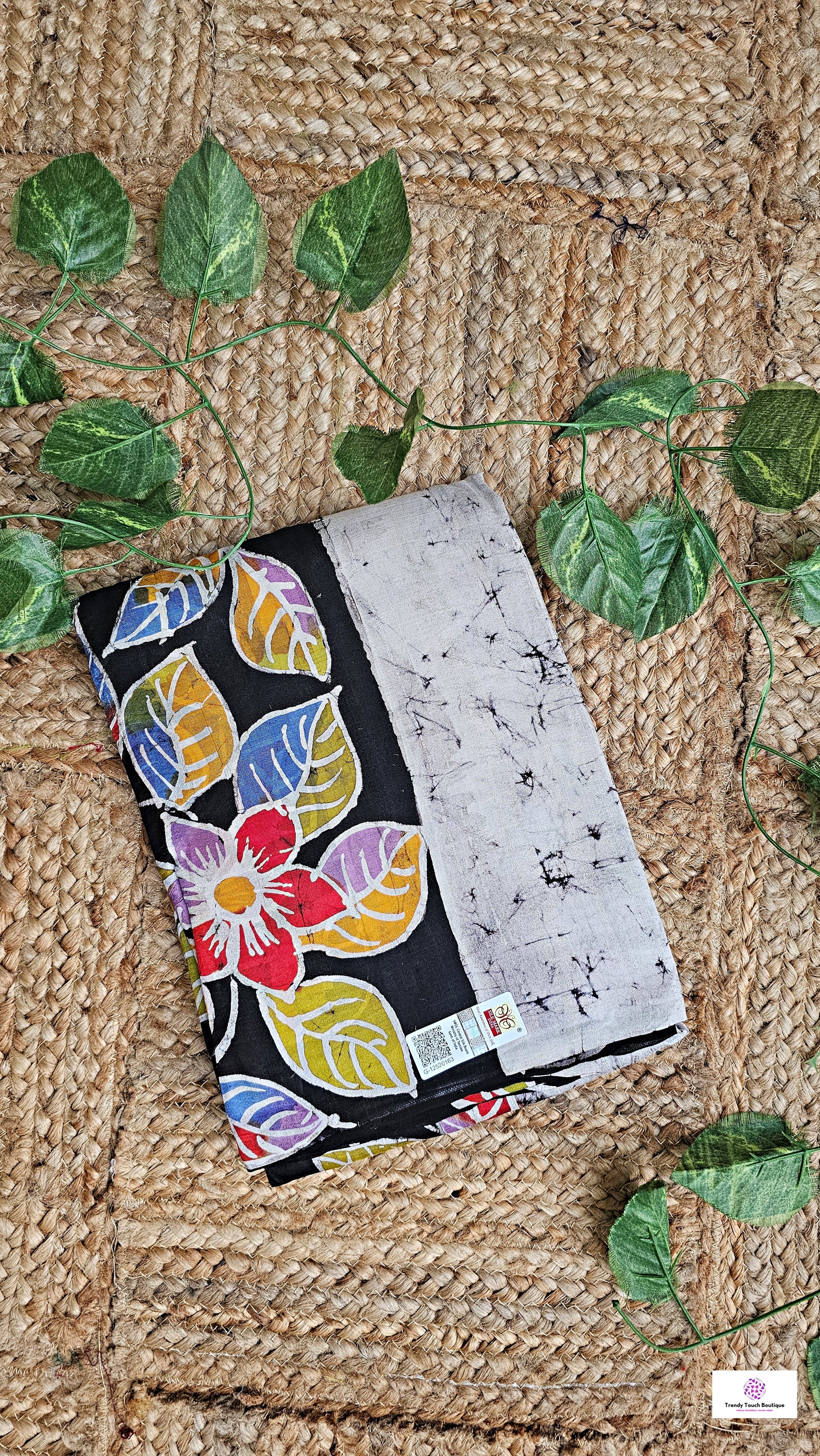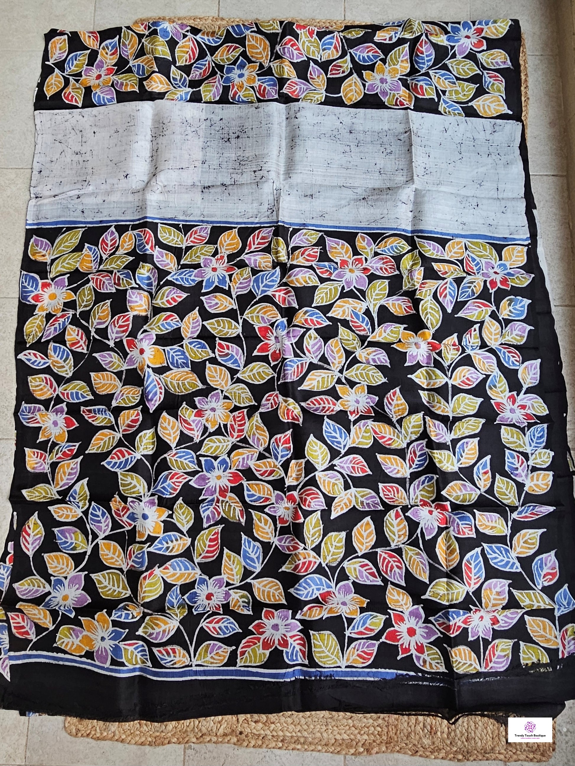 Handloom Hand Wax Batik Murshidabad Mulberry Pure Silk Saree with Silk Mark certification — handcrafted by skilled artisans of West Bengal. Contemporary floral motifs in multicolor hue hand drawn using shoru tuli in on a grey and black cracked batik canvas achieved with traditional manual wax-resist dyeing technique, a heritage art form practiced for generations. Made from 100% pure mulberry silk, woven using 3-ply silk yarn for superior strength, a richer fall, natural sheen. The saree comes with an unstitched running blouse piece.
