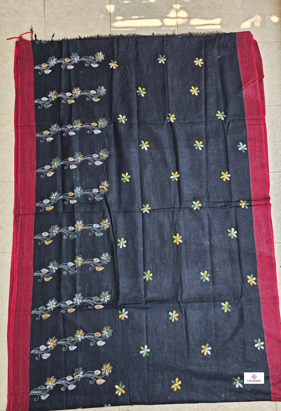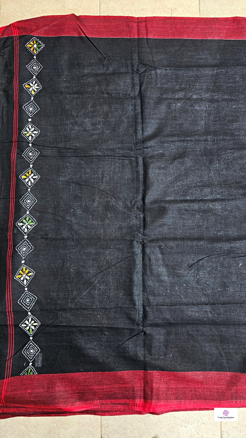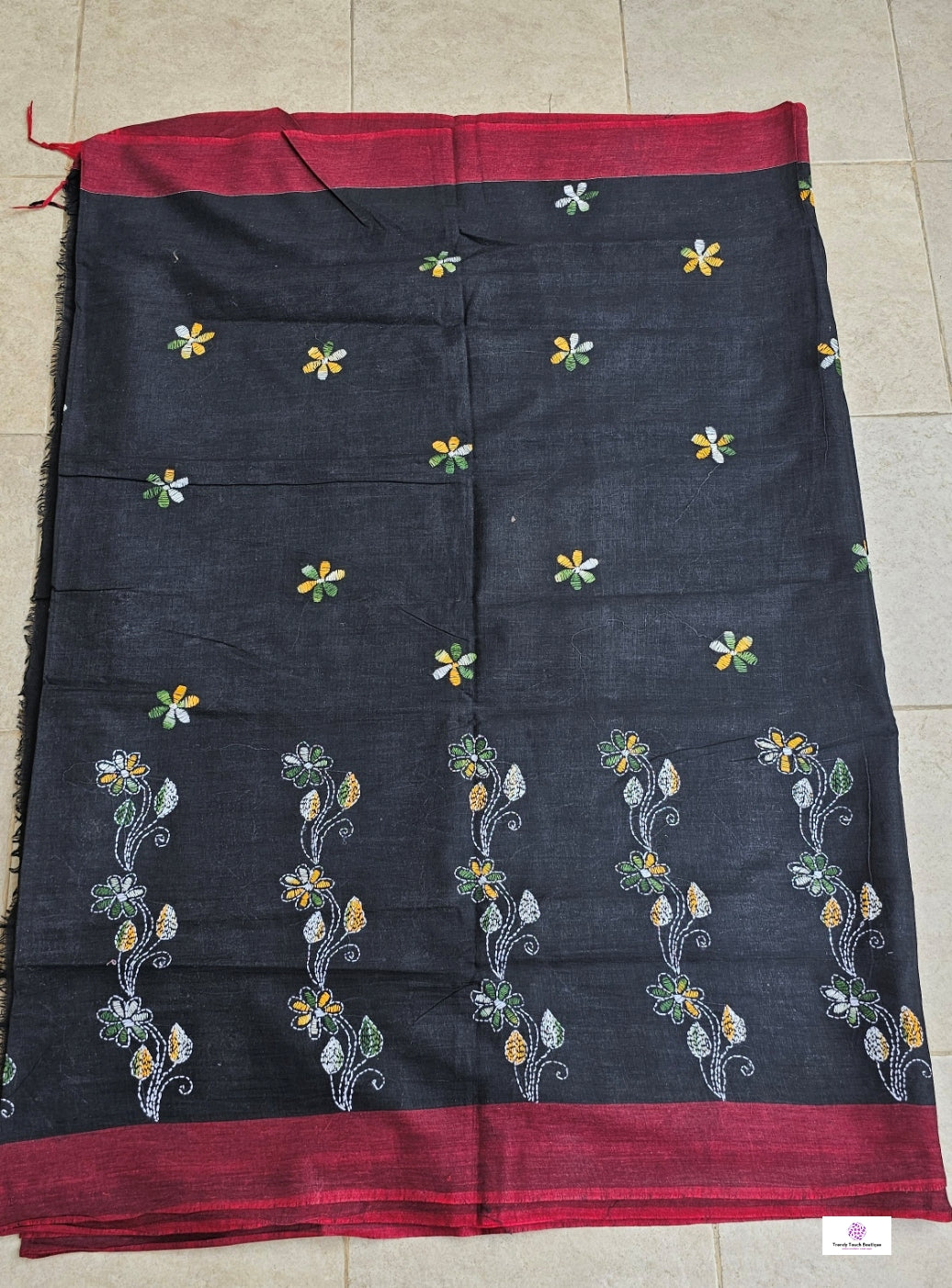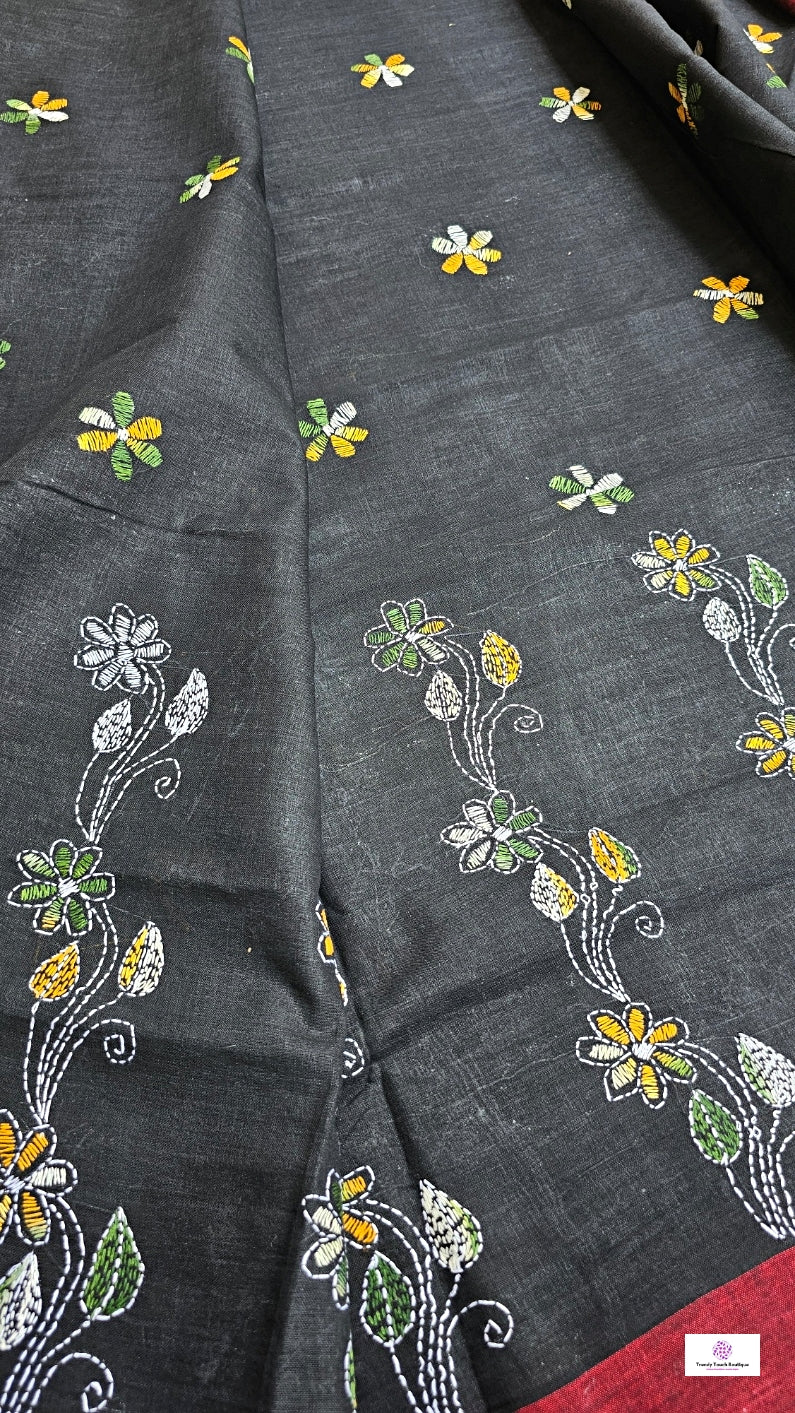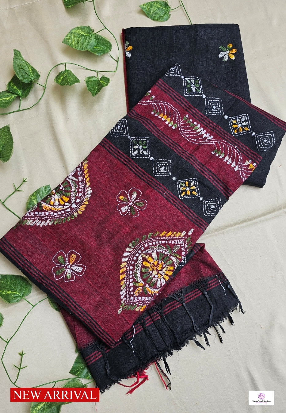 Step into effortless elegance with this pure cotton handloom saree in classic black and maroonâperfect for summer days and festive evenings alike. Intricately hand-embroidered with floral kantha stitches, it blends timeless tradition with comfort. Comes with a matching blouse piece, making it a go-to pick for all seasons and occasions.