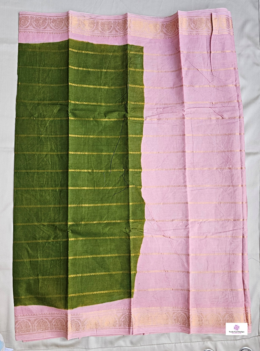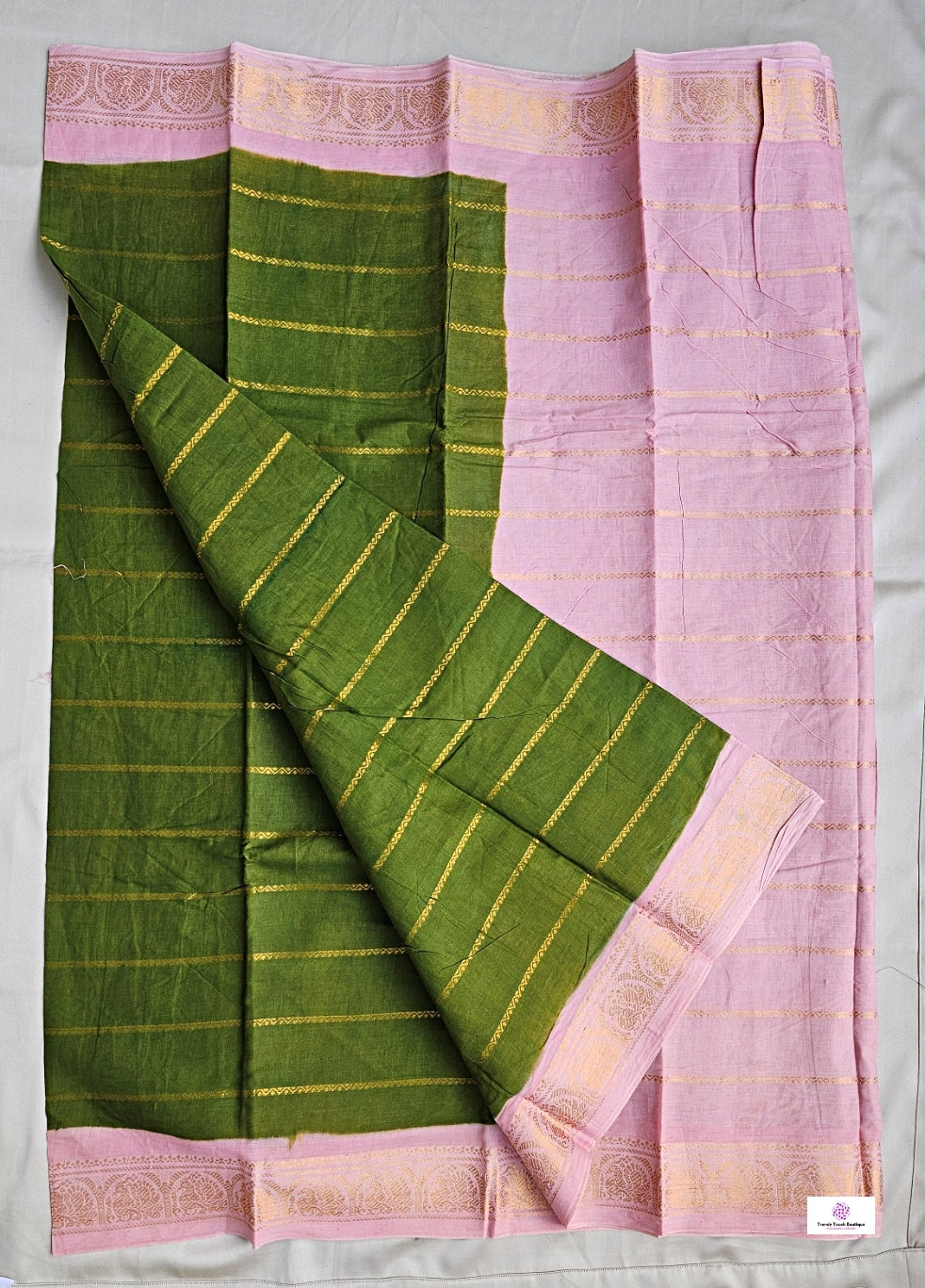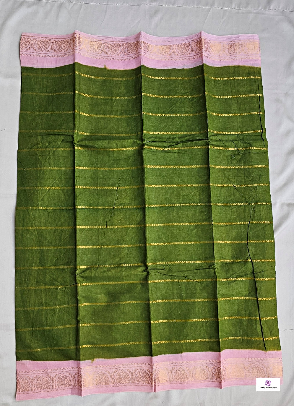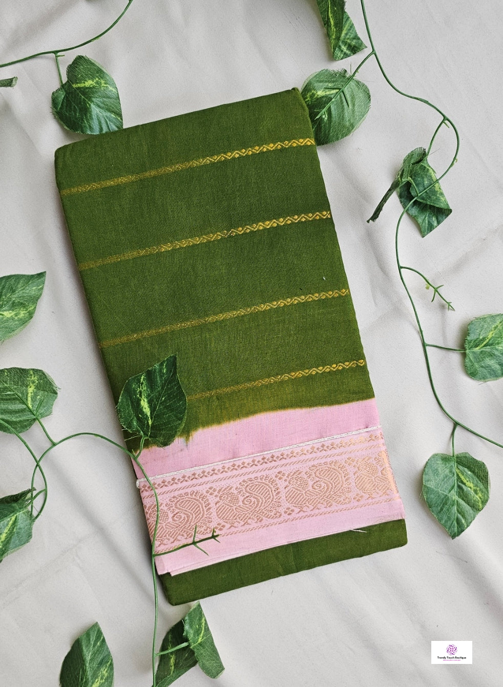 Lightweight, breathable, and comfortable, Sungudi saree in the traditional Velthari pattern in a combination of olive green & pink is perfect for daily and cultural occasions. Their earthy charm, vibrant colors, and airy drape make them a versatile choice for both casual and formal styling.