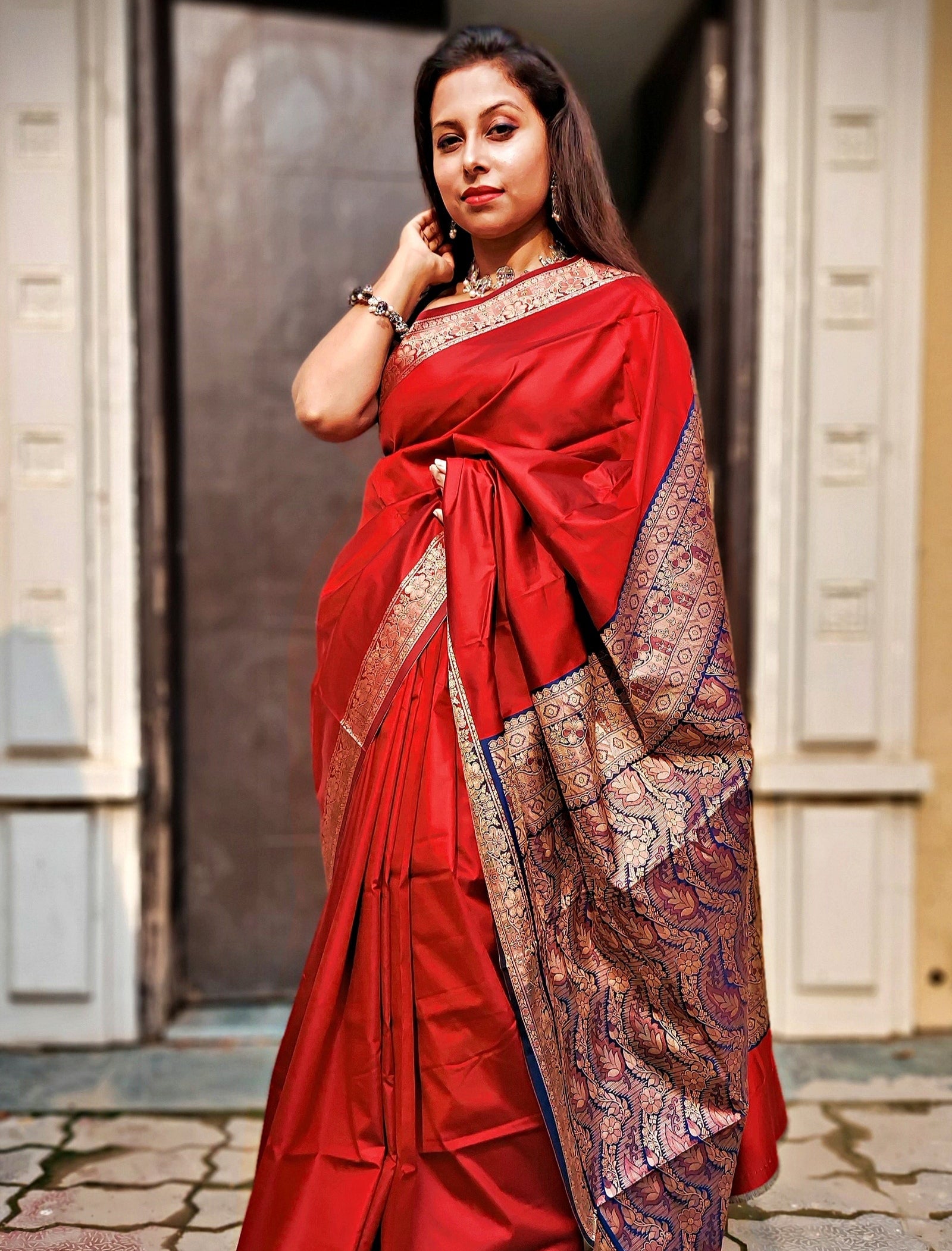 Feel like royalty in this exquisite PARINEETA sari. Woven with a cherry red and rose gold and featuring an intricate floral work on the pallu, this lightweight buttery soft Kataan Silk fabric will keep you comfortable all day as these are very soft silks. Look and feel like a goddess in this luxurious design. Gift this ensemble to your loved one on special occasions like marriage anniversaries, birthdays!