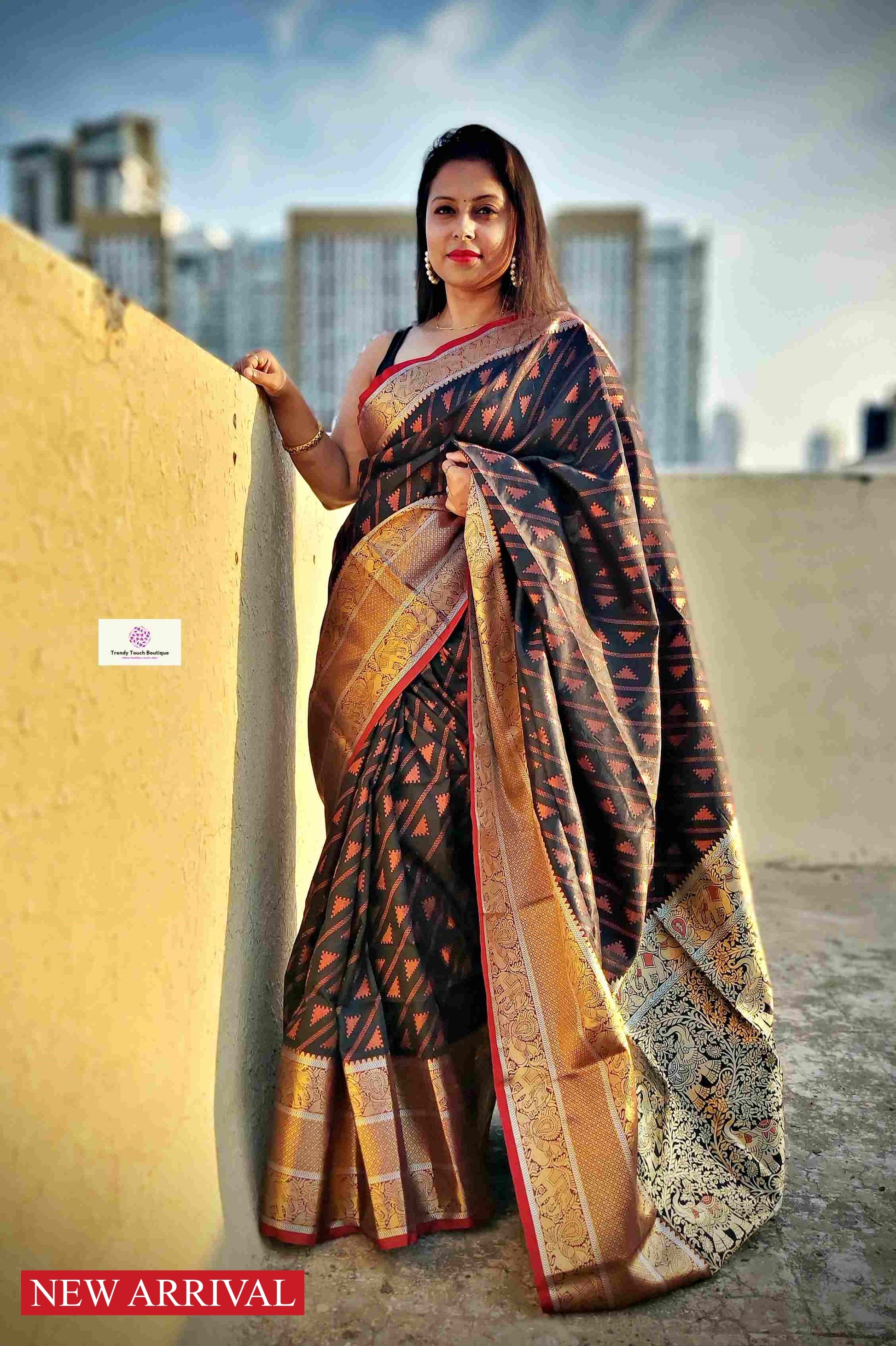 - Color: Black with Jacquard Woven 8-inch Contrast Copper Zari Border