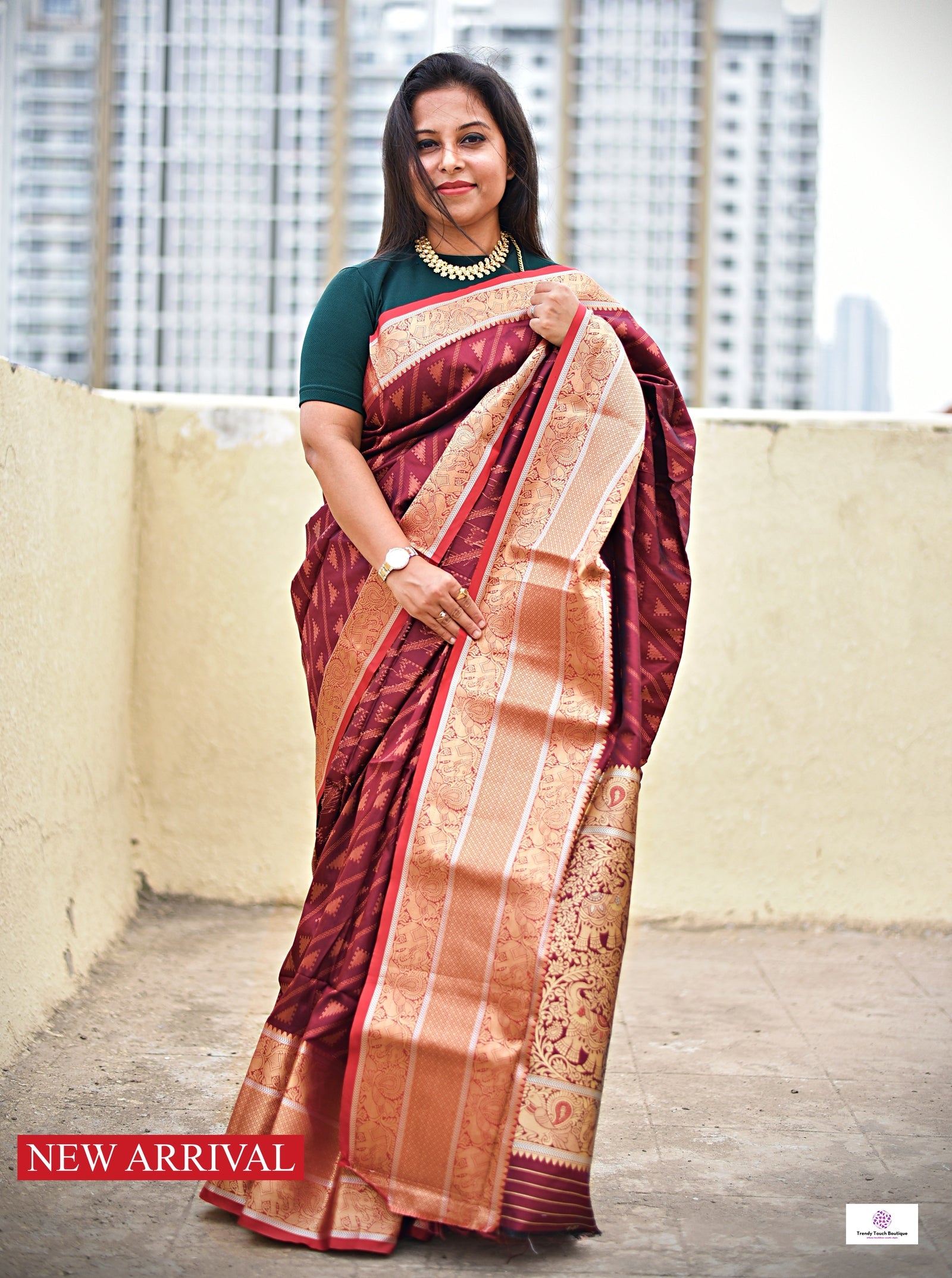 - Color: Maroon & Copper Zari (Jacquard Woven 8-inch border)