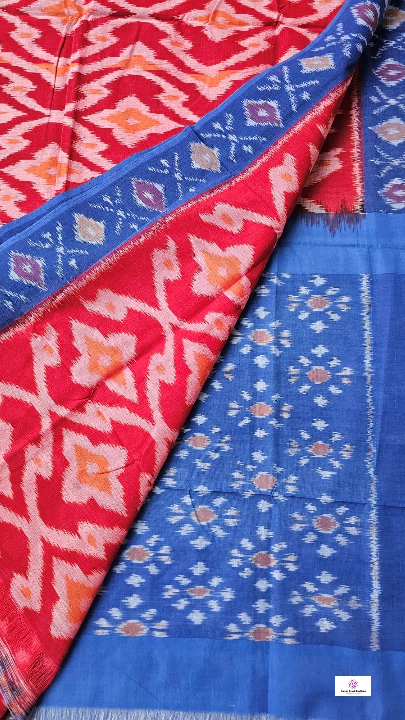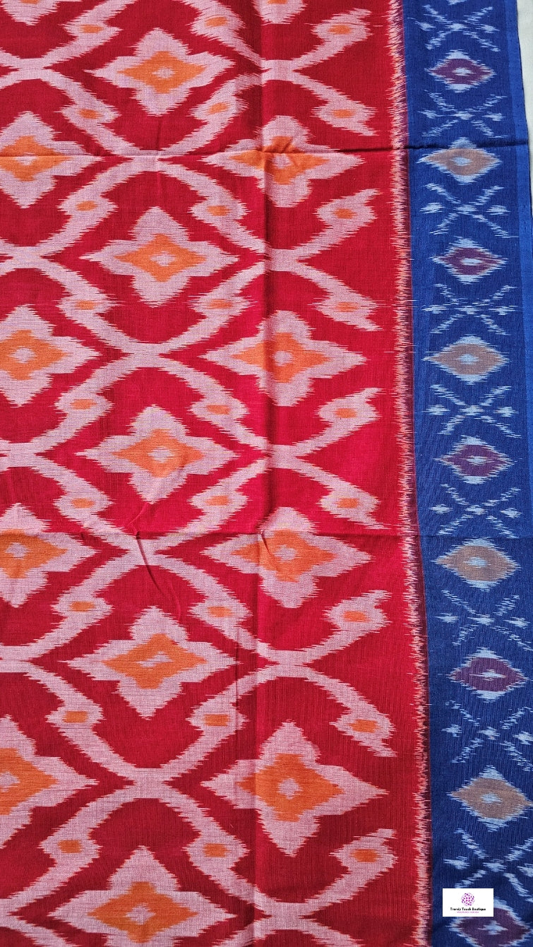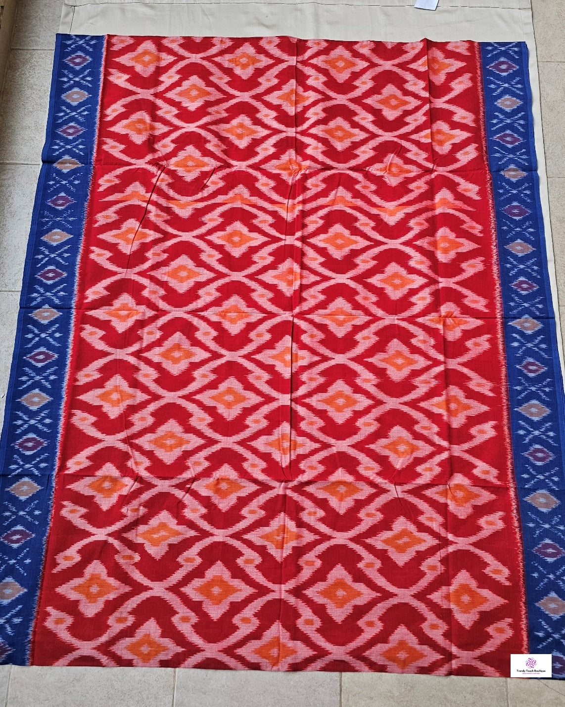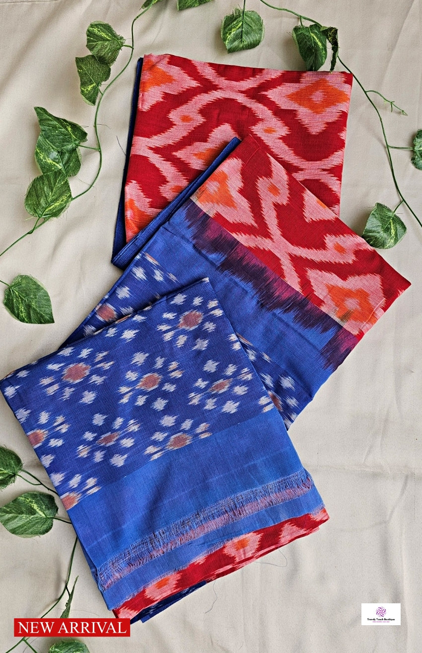 Step into a story woven with heritage—this Pochampally handwoven cotton ikkat saree is not just attire, it’s a tribute to generations of craftsmanship. Made from the purest cotton, its soulful blend of red and blue and the time-honored geometric motifs reflect the heart and hands of artisans who breathe life into every thread. This is more than just a saree—it’s a piece of cultural pride, a legacy wrapped in grace, and a timeless expression of artistry you can carry close to you.