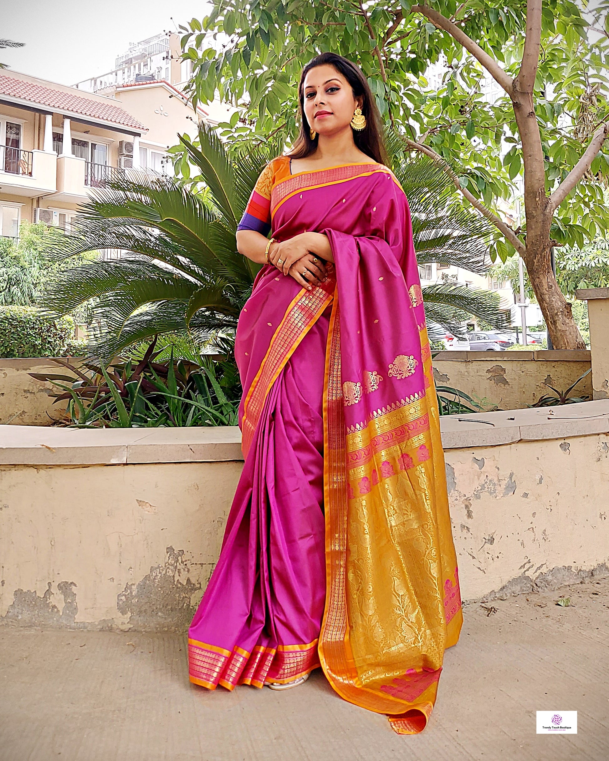 This gracious traditional silk weave of Orissa in Yellow and Pink Magenta combination with golden zari work on the border and pallu is a concoction and a piece of art altogether. Own our SAMPURNA - an ethnic elegance that resembles ageless legacy and oomph up your style statement or gift it to newly weds, bride-to-be, or loved ones! Choose a style that transcends time and celebrate the love of a soft silk saree!