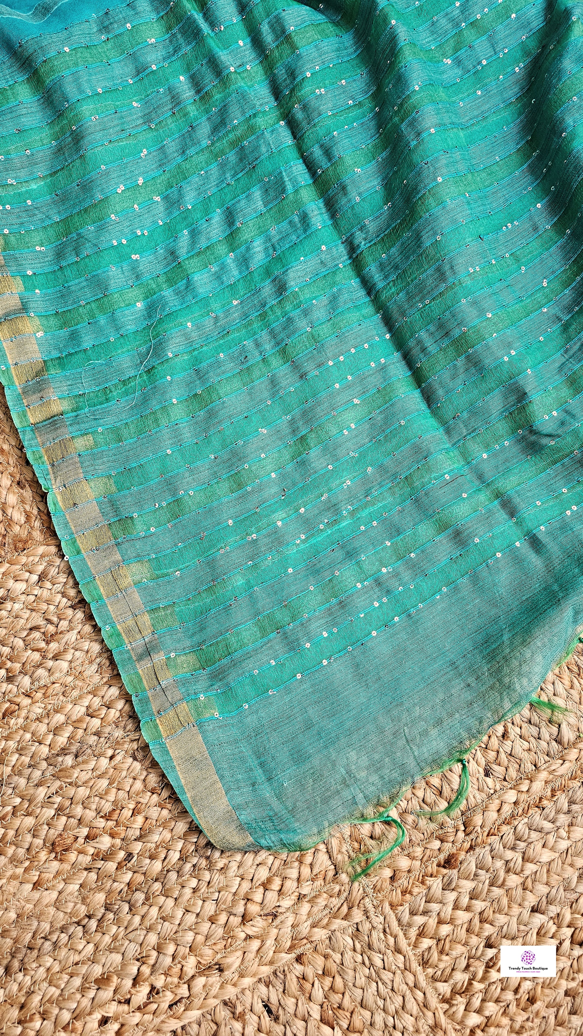 This graceful saree features alternating dark and light sea green stripes, embellished with sequins on a sheer fabric palla. Perfect for any occasion, from casual family get togethers to parties. Add a touch of elegance and style to your look with this lightweight saree.