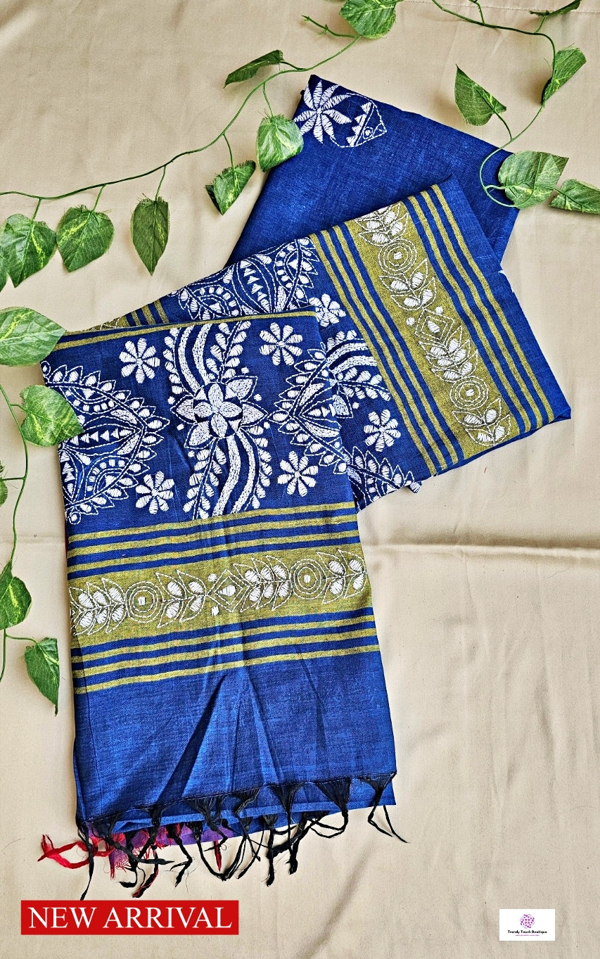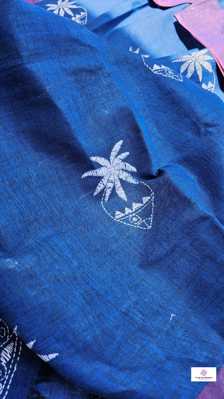 Step into effortless elegance with this pure cotton handloom saree in green and blue contrast with pinkish border—perfect for summer days and festive evenings alike. Intricately hand-embroidered with floral kantha stitches in white pink multicolor shaded thread, it blends timeless tradition with comfort. Comes with a matching blouse piece, making it a go-to pick for all seasons and occasions.