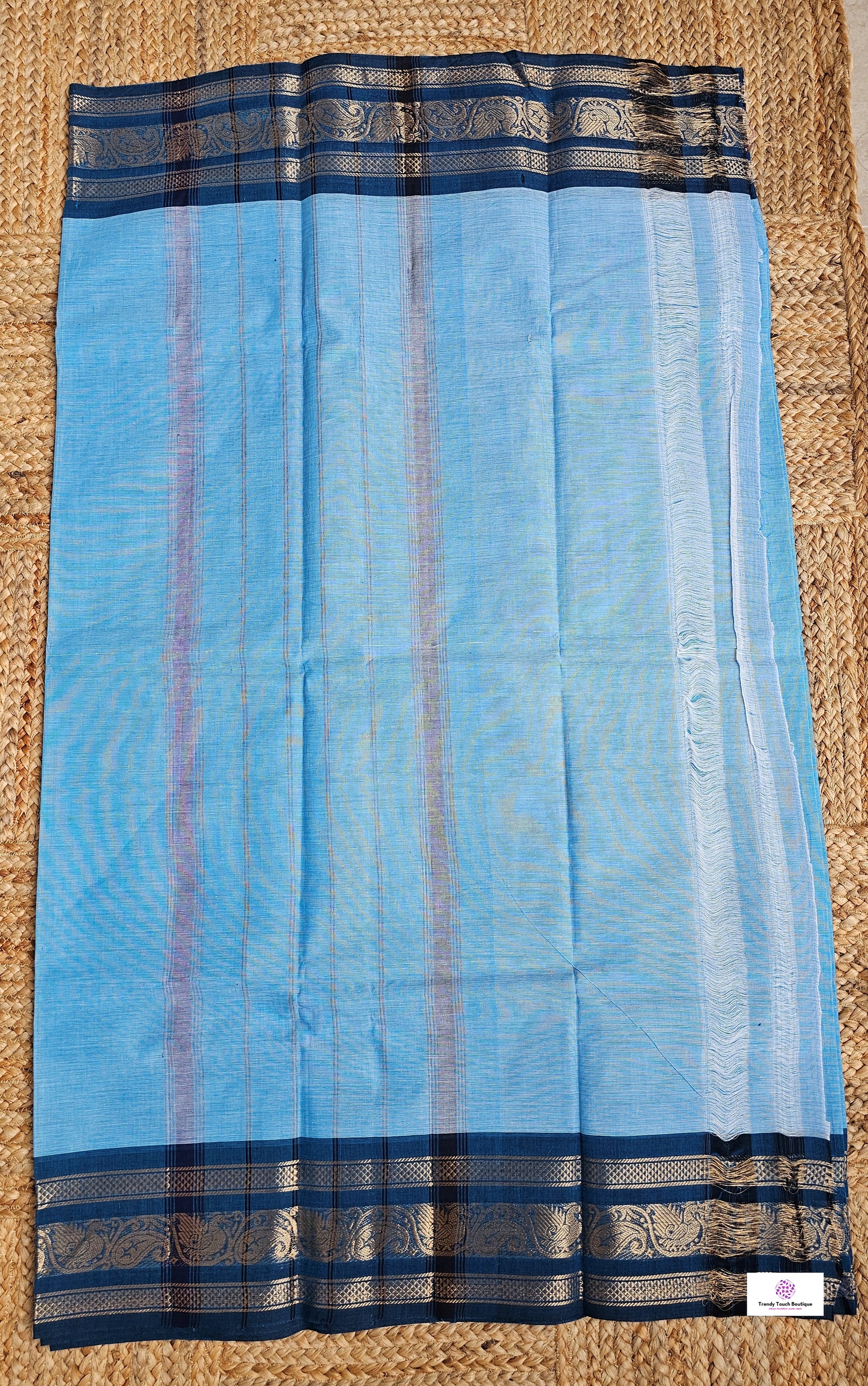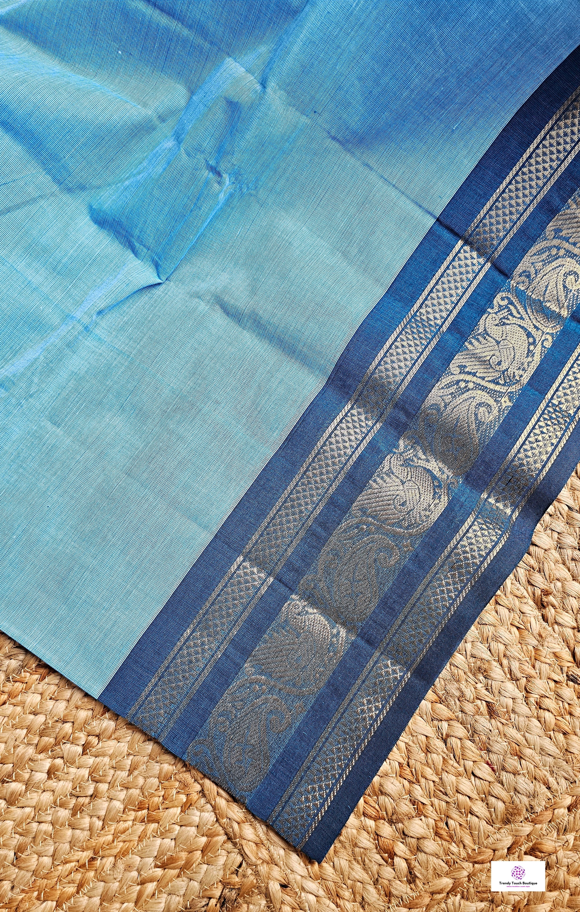This chettinad cotton saree is perfect for office, work wear, summer, or small functions. Crafted from lightweight, breathable cotton for all-day comfort, this saree has powder blue and white dual tone body with traditional peacock motif zari work on a teal blue border. Known for its durability, versatility and design make, its ideal for daily wear and festive occasions.