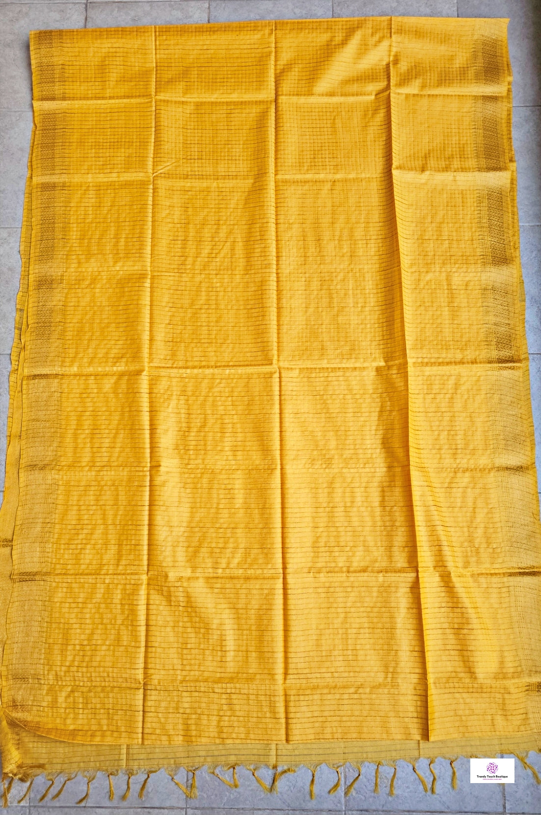 Lightweight and flowy, the semi Mangalagiri check saree in yellow with traditional checked pattern adds texture and subtle elegance to your entire look. For the ones who wants to keep it simple yet classy, this drape is perfect for all special occasions including haldi, marriage, wedding etc!