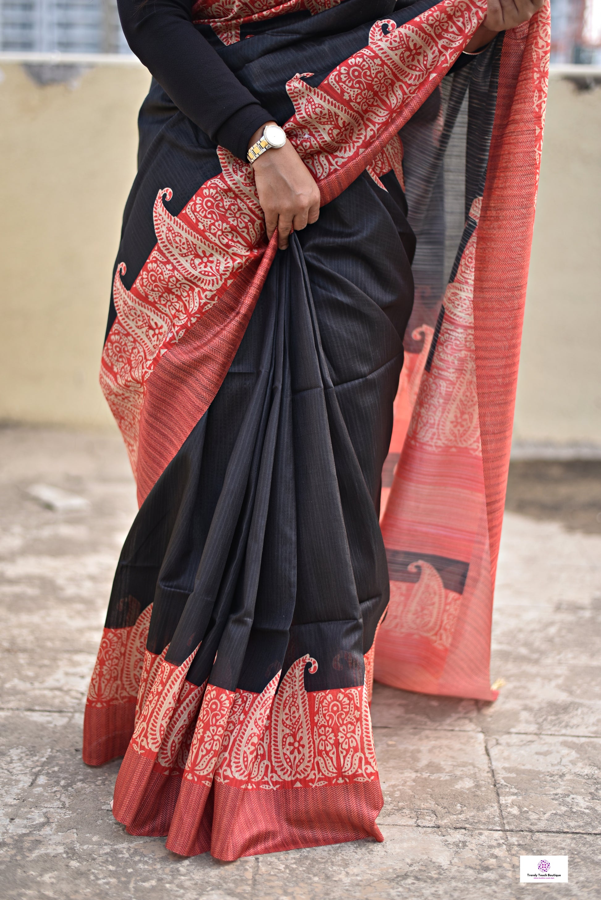This semi tussar silk saree combines style and practicality, featuring paisley in contemporary patterns on the saree border and palla in red. An iconic black and red combination, this lightweight drape is perfect for every busy woman. Low-maintenance, budget-friendly, and effortlessly stylishâan ideal addition to your versatile, comfort-focused saree wardrobe. Embrace a style that keeps up with your everyday pace!