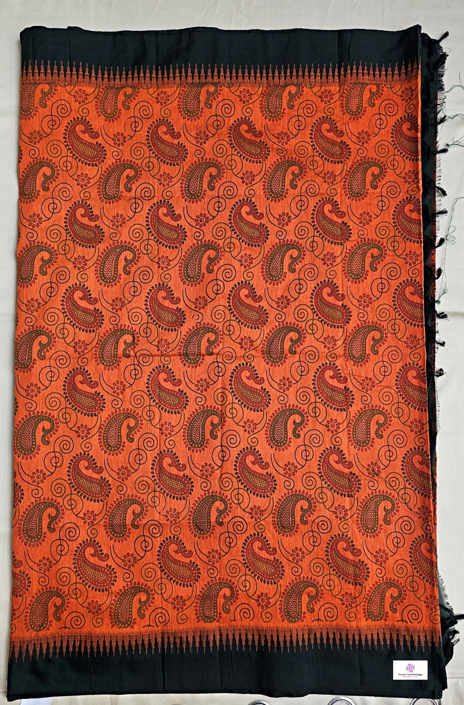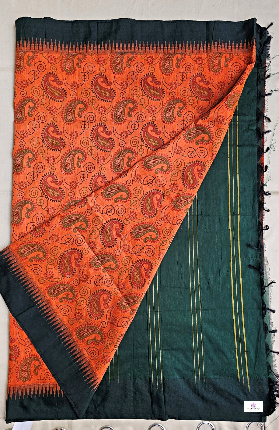 Lightweight, breathable, and effortlessly elegant, this Kalyani cotton saree perfectly blends tradition and modern charm. The vibrant orange body adorned with contemporary floral Kalamkari prints beautifully contrasts with the classic bottle green zari temple border and pallu. Crafted for comfort, its airy texture makes it an ideal pick for warm weather, while the rich design ensures a classy look for both formal and special occasions. A timeless addition to your wardrobe!