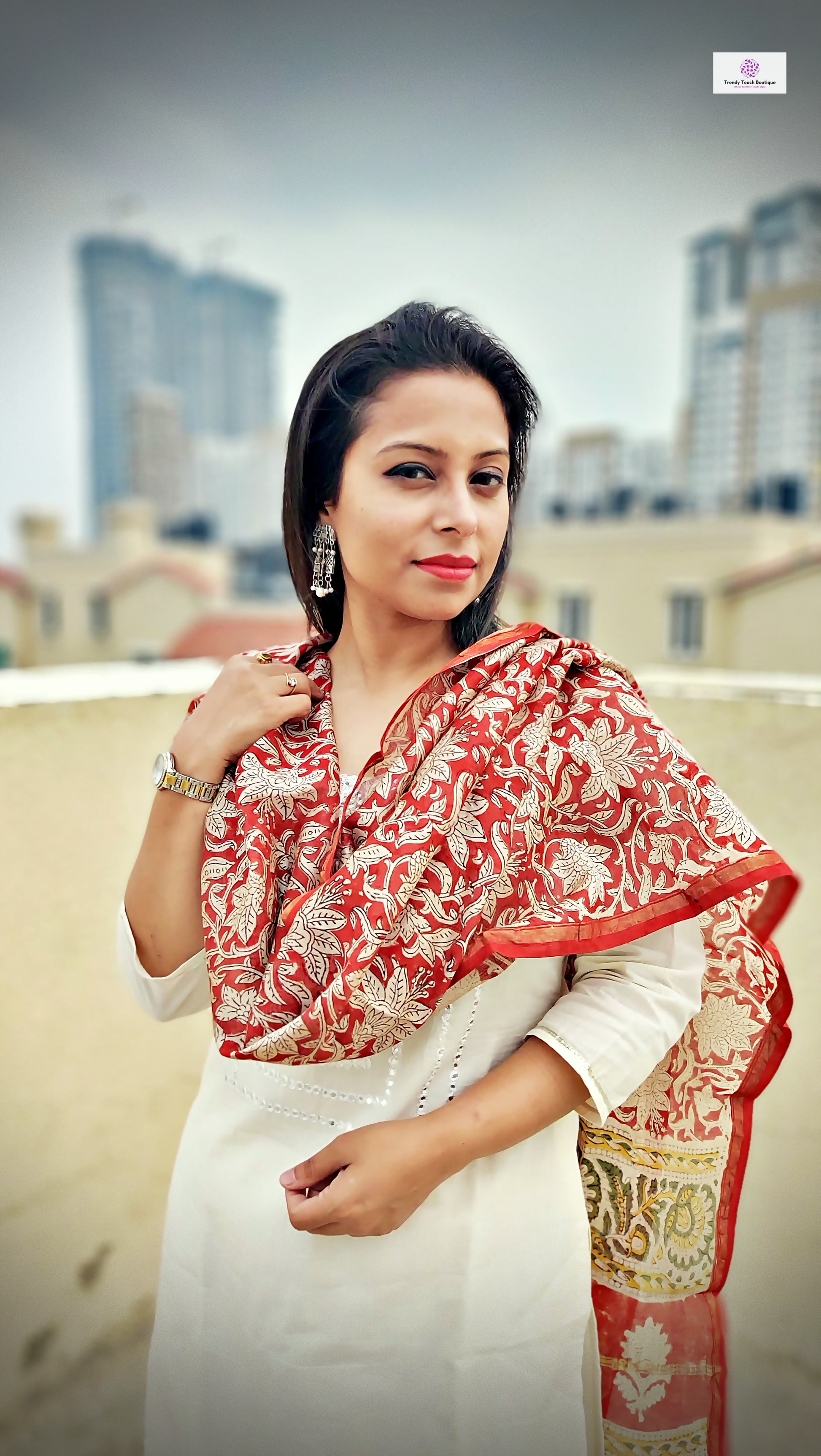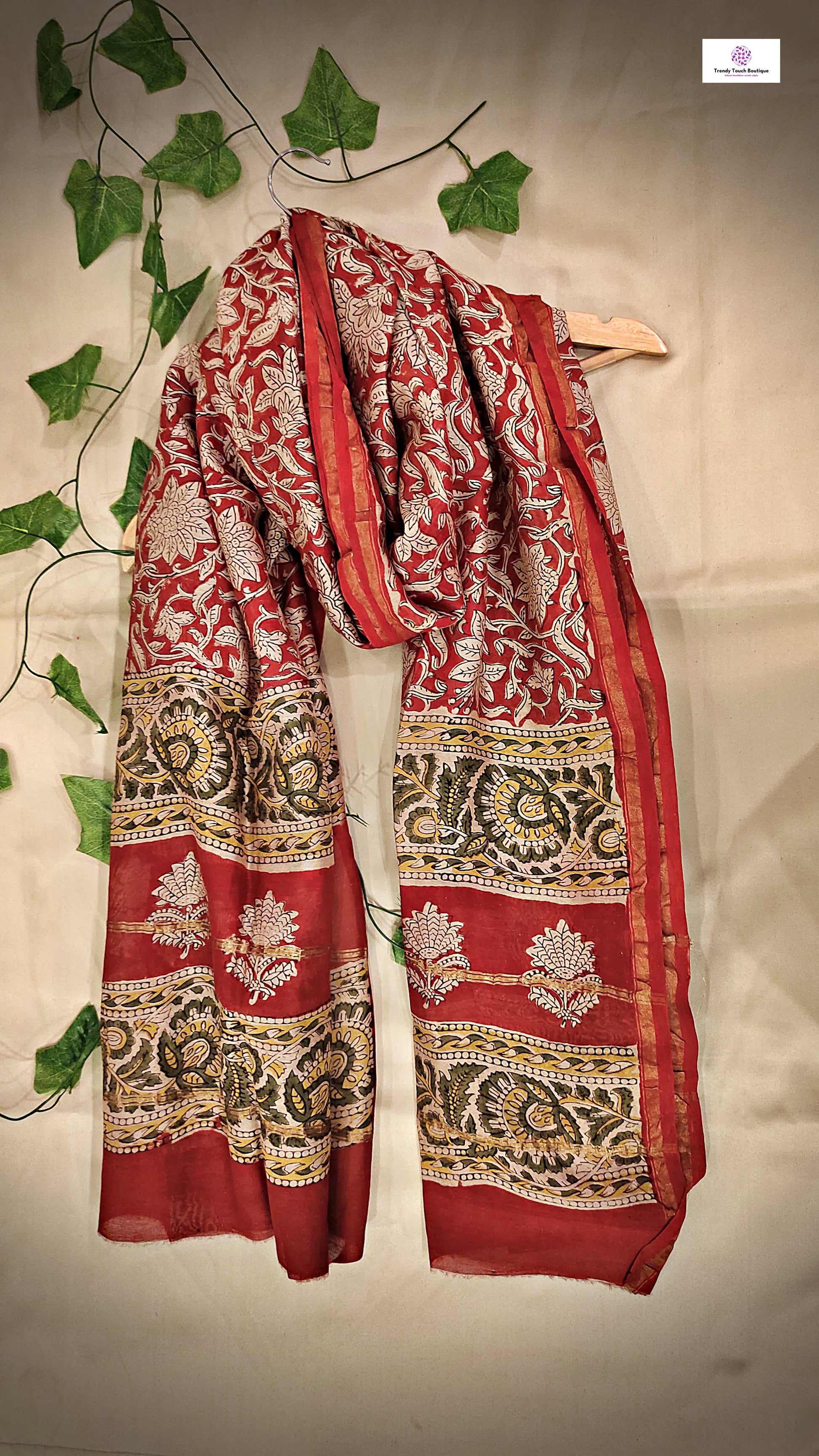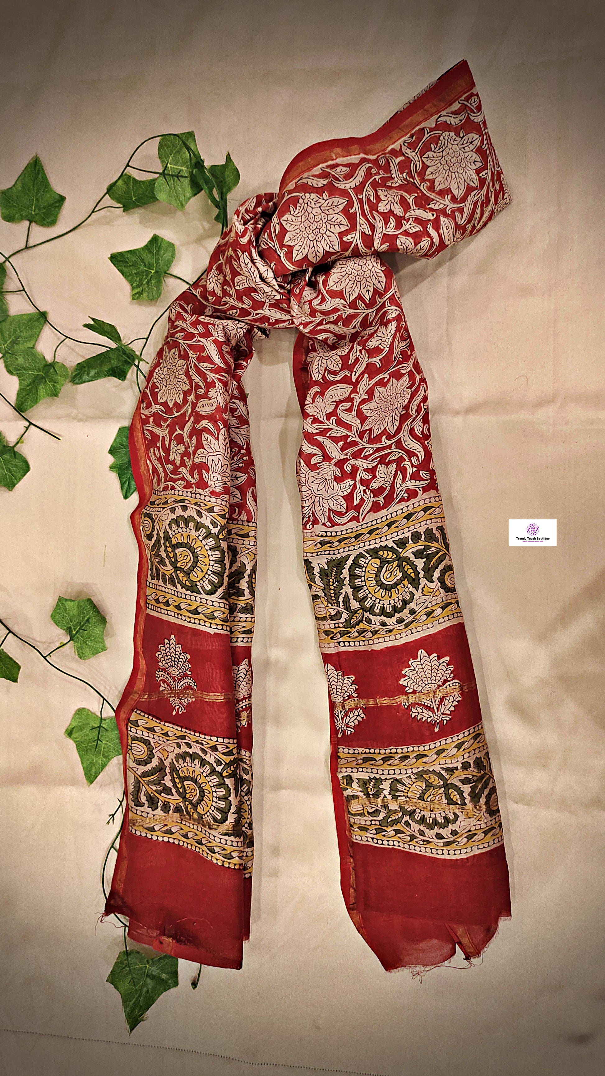 Add vibrance to your ethnic kurti styling with this rich and royal kalamkari motif-inspired red Chanderi silk dupatta hand block printed in pure natural dye! Perfect for pairing with all your kurtis and making a statement at the office or casual get-togethers. Accessorize it with light oxidized jewellery for that instant chic look!
