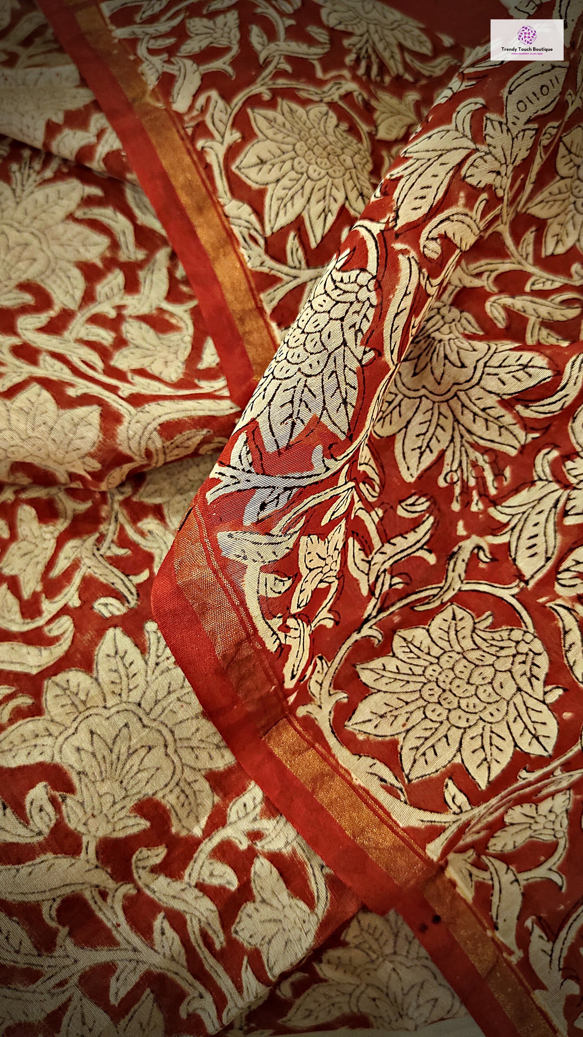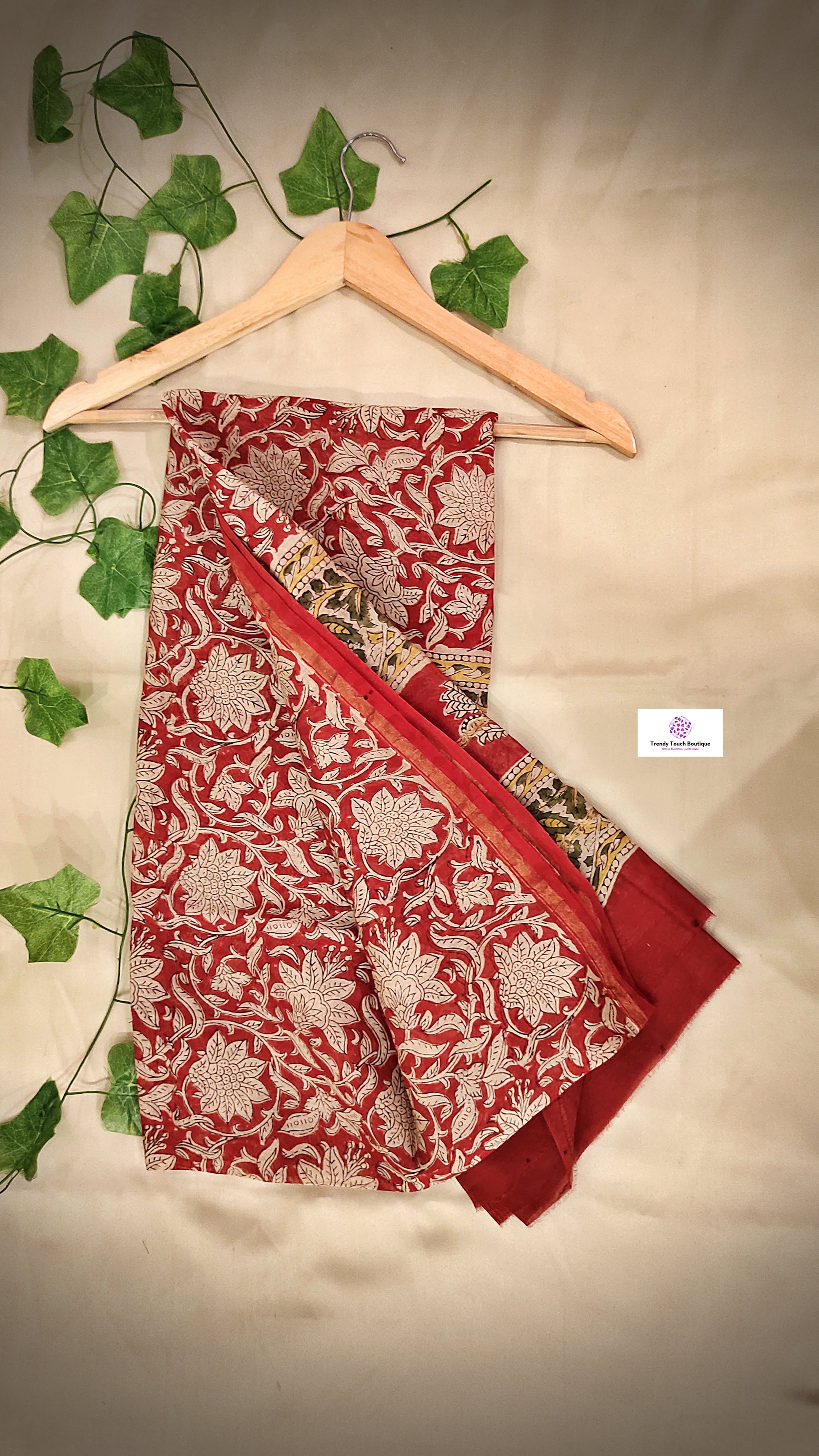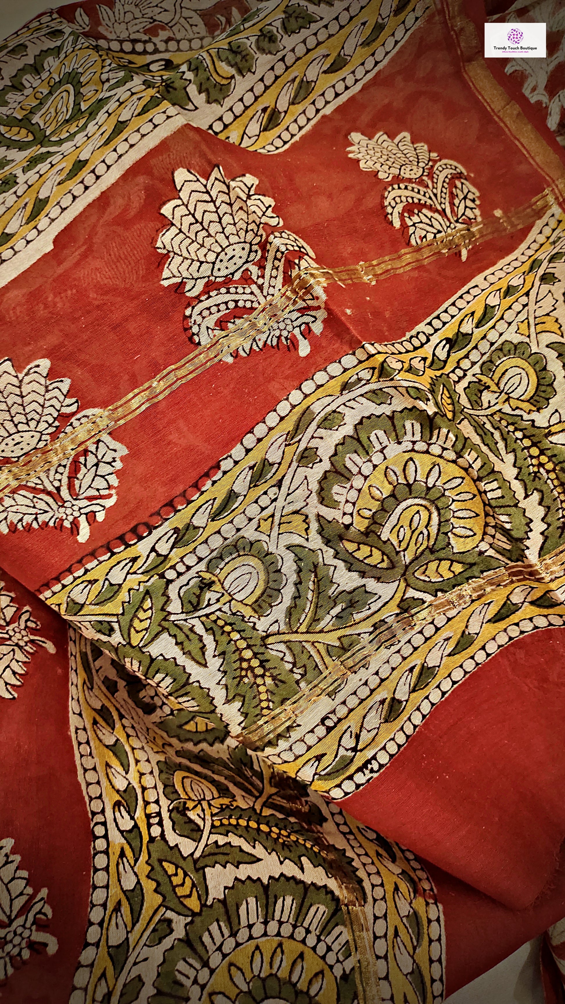 Add vibrance to your ethnic kurti styling with this rich and royal kalamkari motif-inspired red Chanderi silk dupatta hand block printed in pure natural dye! Perfect for pairing with all your kurtis and making a statement at the office or casual get-togethers. Accessorize it with light oxidized jewellery for that instant chic look!